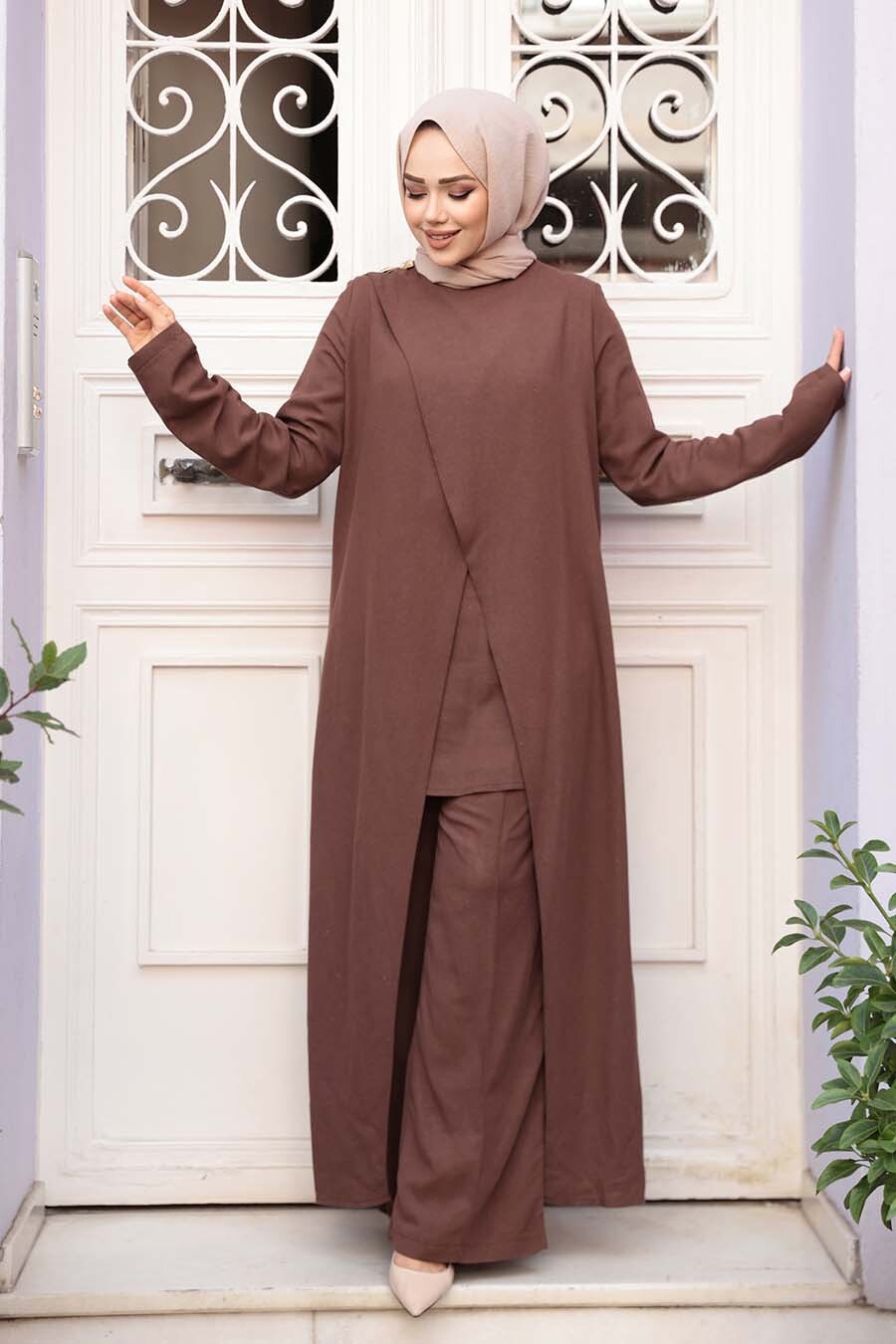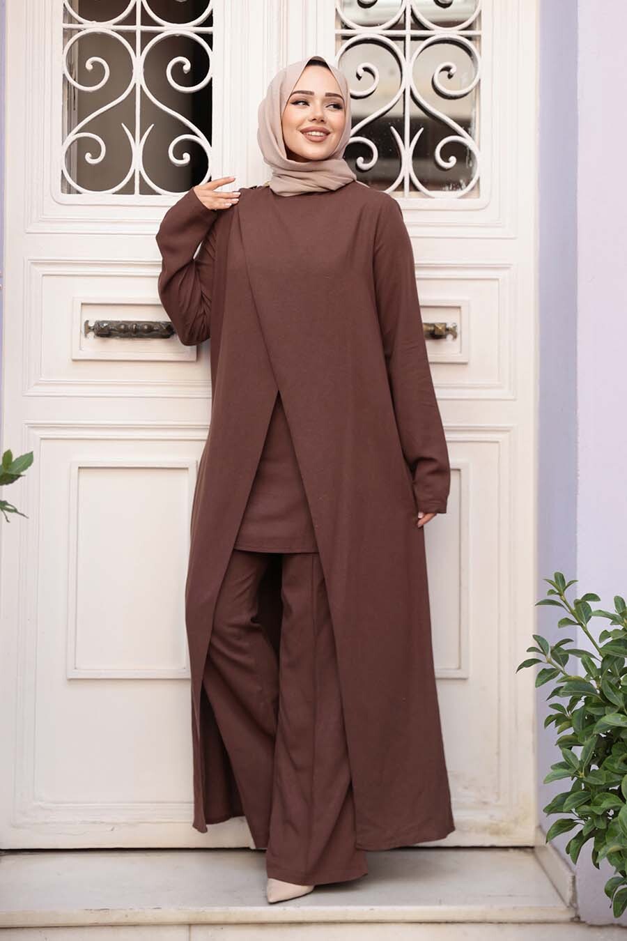 Ürün Özelliği:Sıfır yaka, uzun kollu, etek ucu asimetrik kesim, içlikli pantolon belden lastikli ve geniş paçadır. Ürün Boyu:Üst:135 cm Alt:108 cm