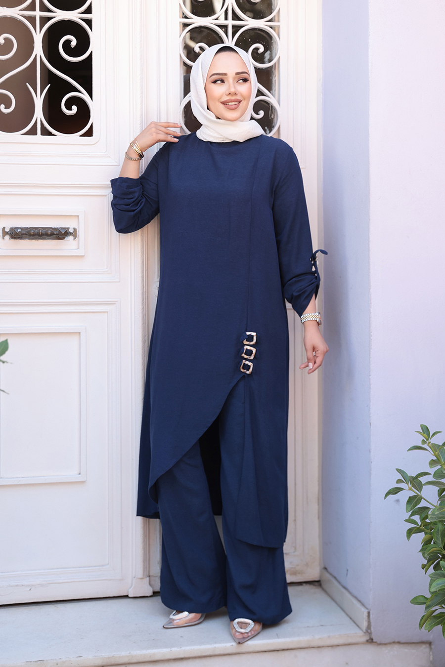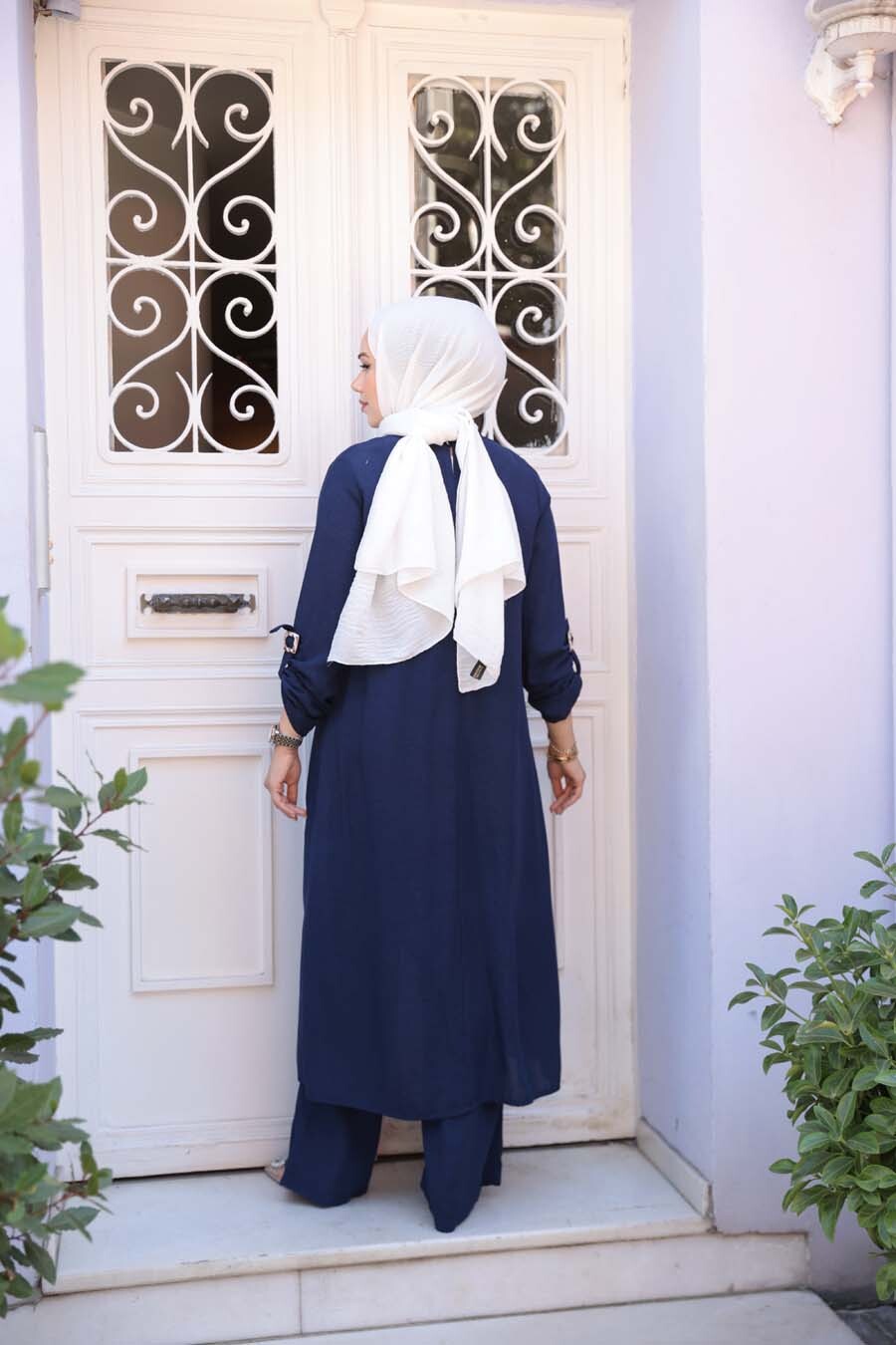 Ürün Özelliği: Sıfır yaka, uzun kollu, kol ucu ayarlanabilir, düğme detaylı, etek ucu asimetrik kesim, pantolon belden lastikli ve geniş paçadır. Ürün Boyu:Üst:125 cm Alt:107cm