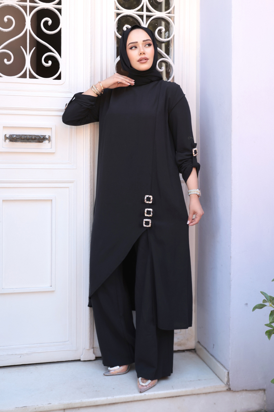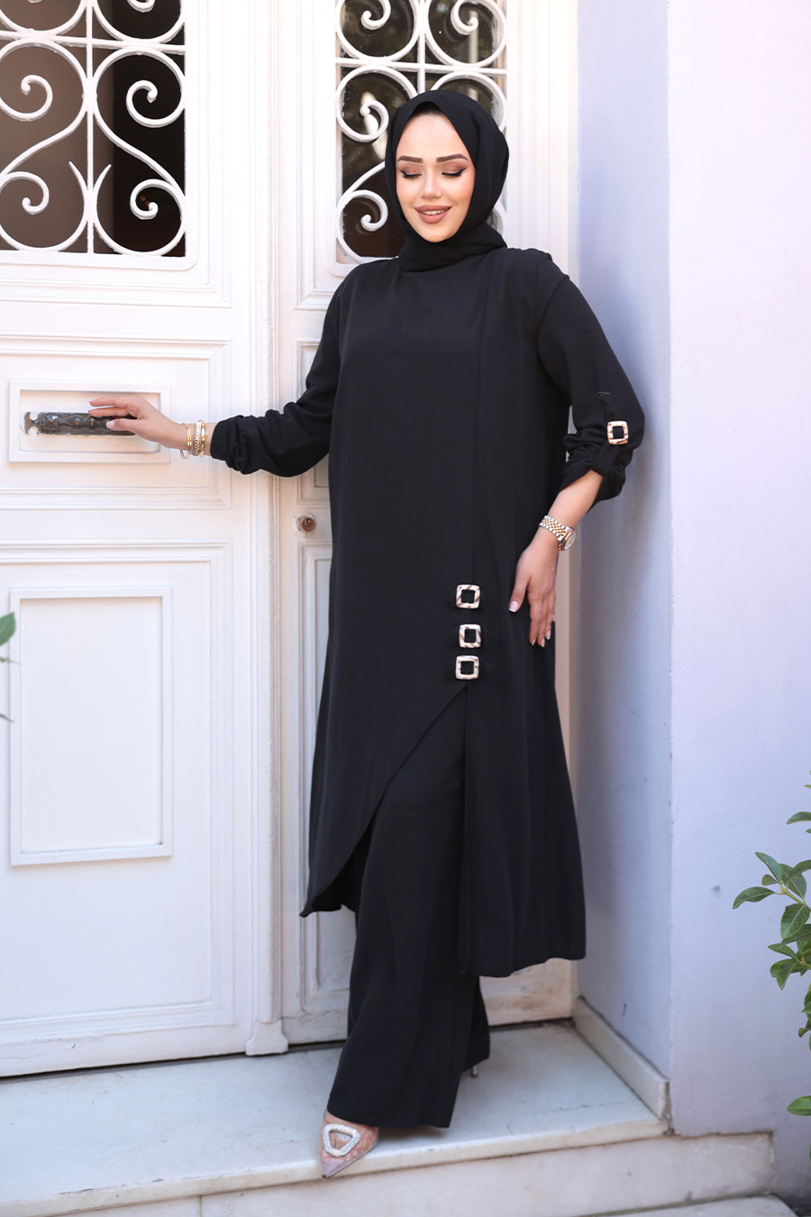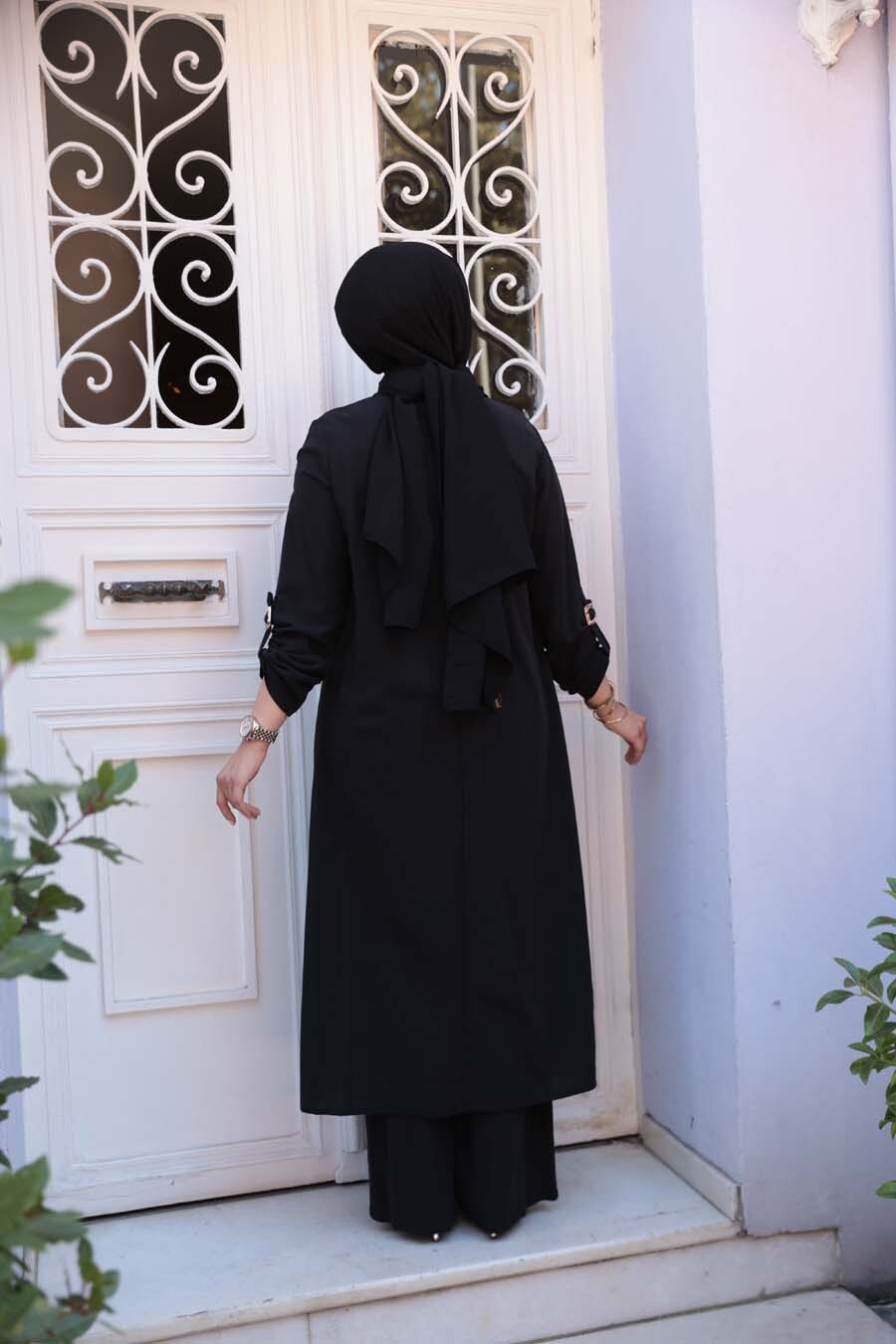 Ürün Özelliği: Sıfır yaka, uzun kollu, kol ucu ayarlanabilir, düğme detaylı, etek ucu asimetrik kesim, pantolon belden lastikli ve geniş paçadır. Ürün Boyu:Üst:125 cm Alt:107cm