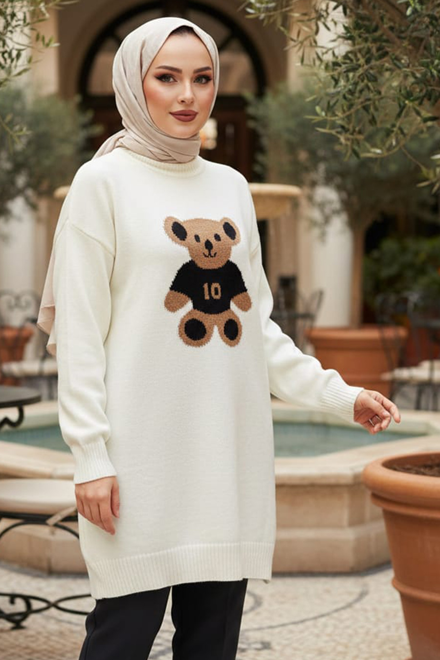 Ayıcık Desenli Ekru Tesettür Triko Kazak 87961E