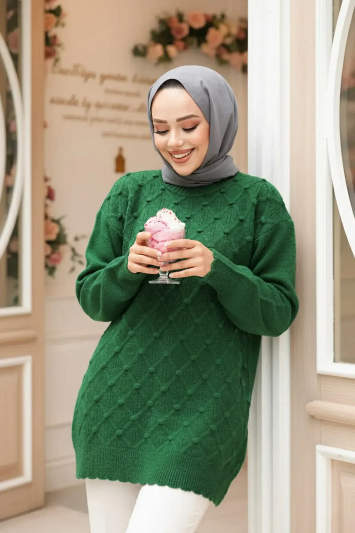 Ürün Özelliği: Sıfır yaka, uzun kollu, kol ucu lastikli, puantiye ve baklava desenlidir.