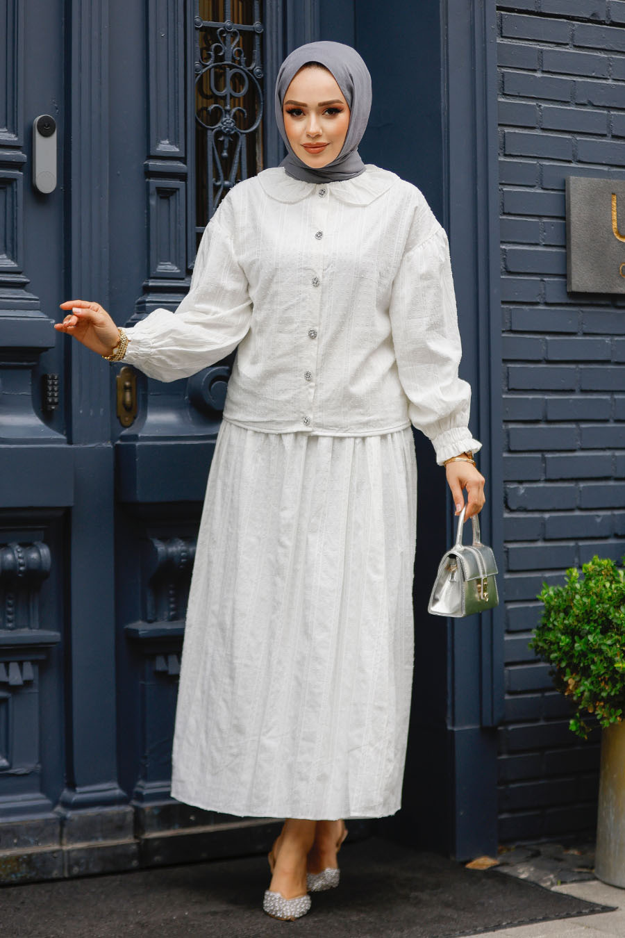 Ürün Özelliği: Klasik yaka, uzun kollu, kol ucu lastikli, ön ortadan düğmeli, etek belden lastikli ve eteği kloş kesimdir.