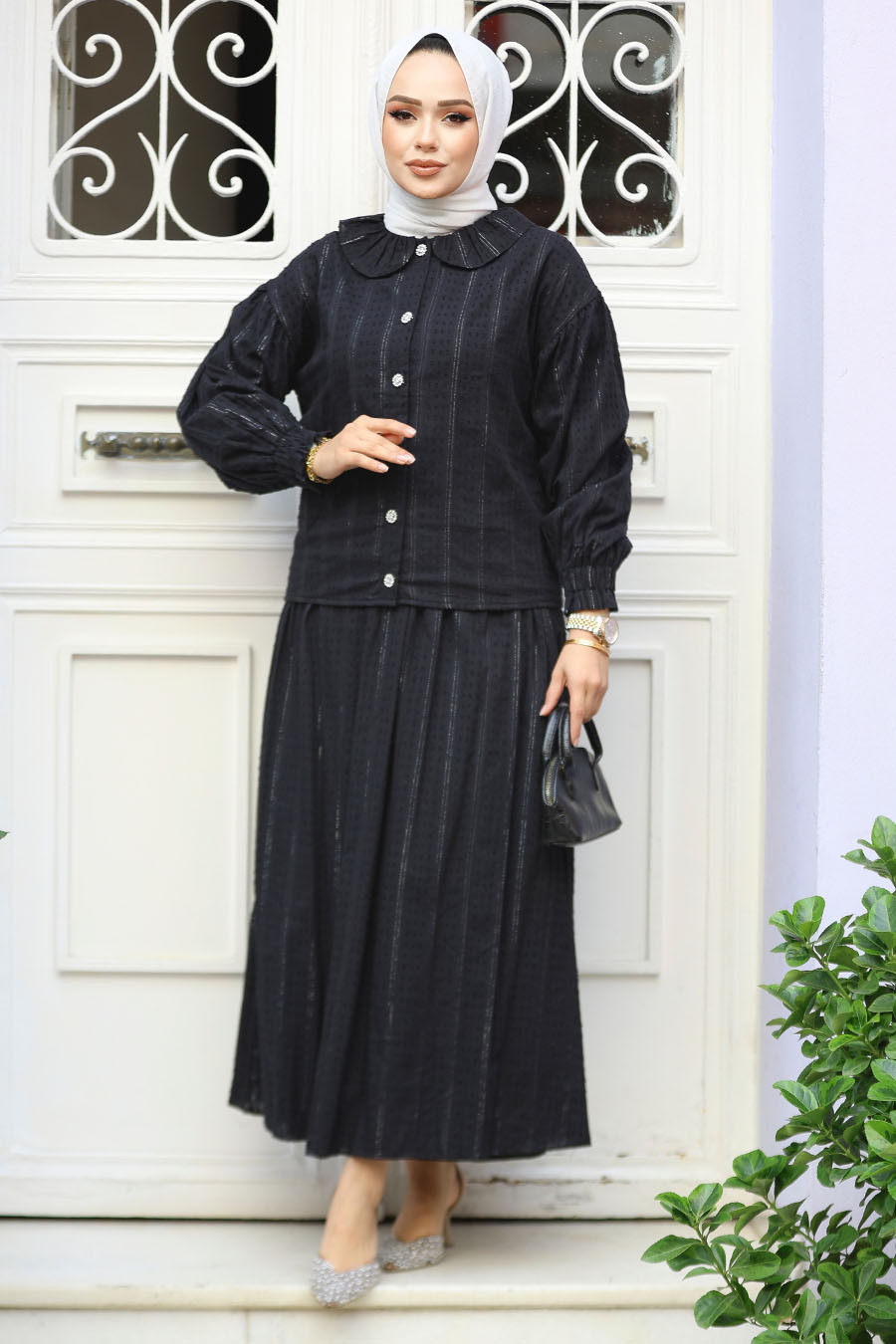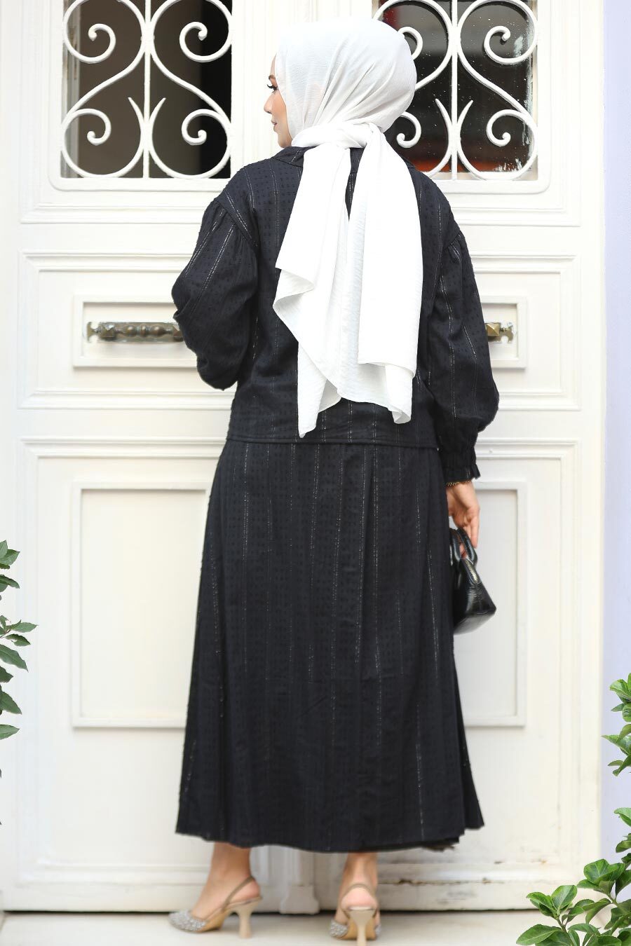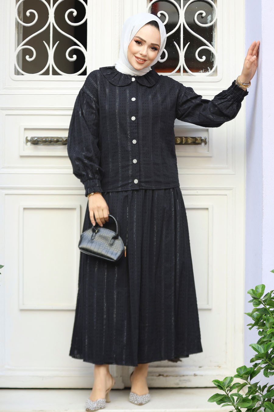 Ürün Özelliği: Klasik yaka, uzun kollu, kol ucu lastikli, ön ortadan düğmeli, etek belden lastikli ve eteği kloş kesimdir.