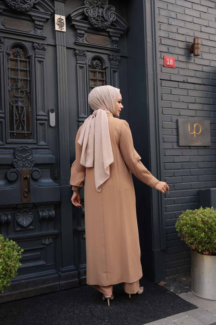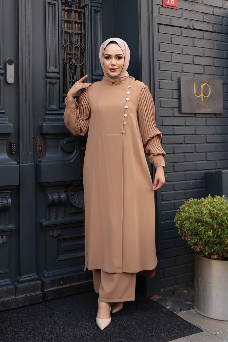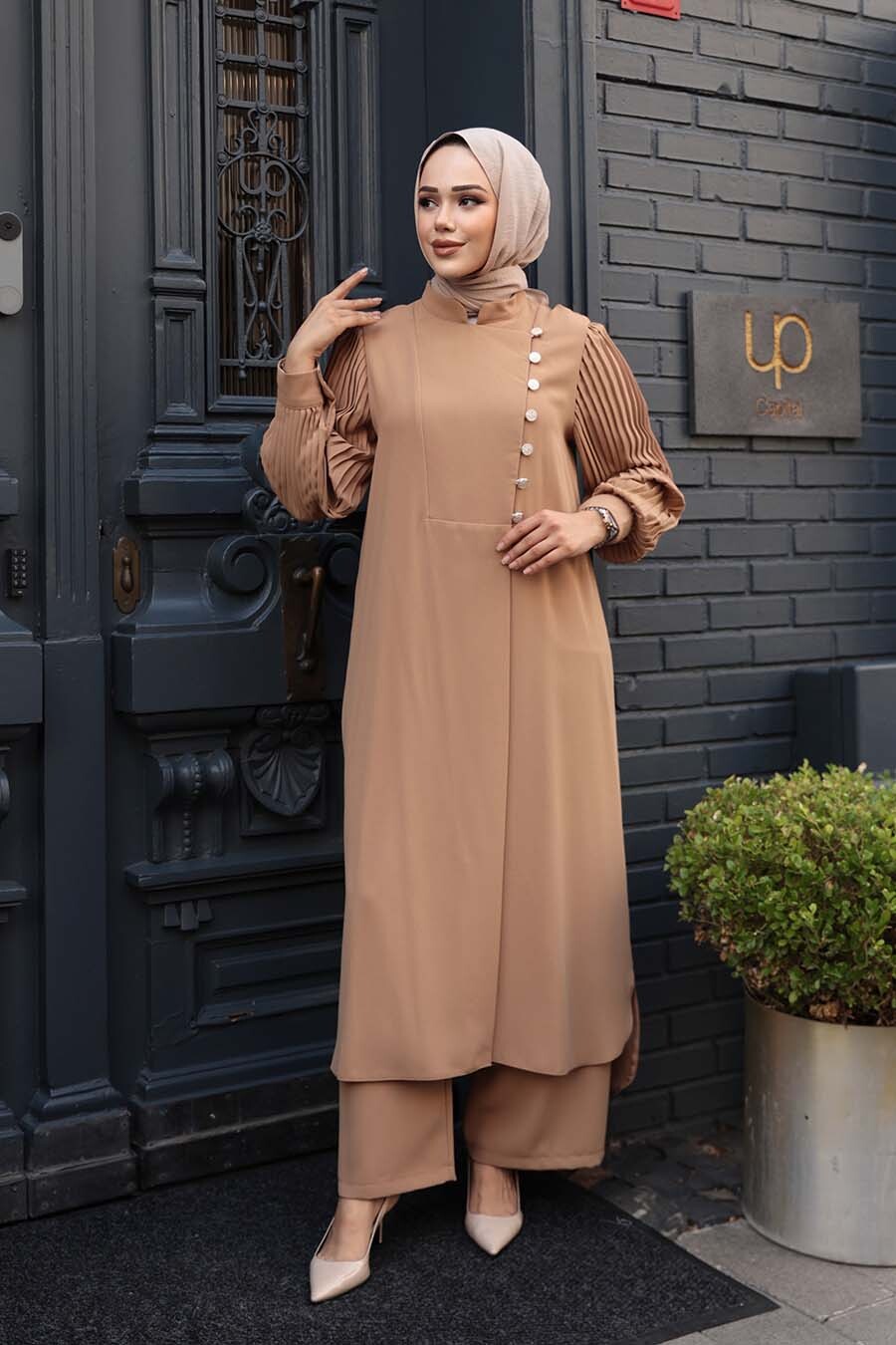 Ürün Özelliği: Dik yaka, uzun kollu, manşetli, kolları pileli, düğme detaylı, etek ucu yırtmaç detaylı, pantolon belden lastikli ve geniş paçadır.