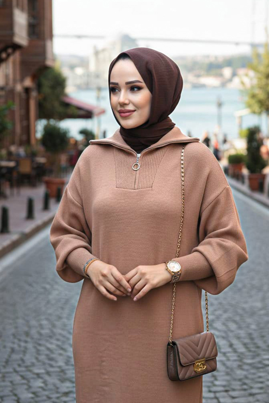 Ürün Özelliği: Boğazlı yaka, uzun kollu, kol ucu lastikli, etek ucu yırtmaç detaylı ve yakası fermuarlıdır.