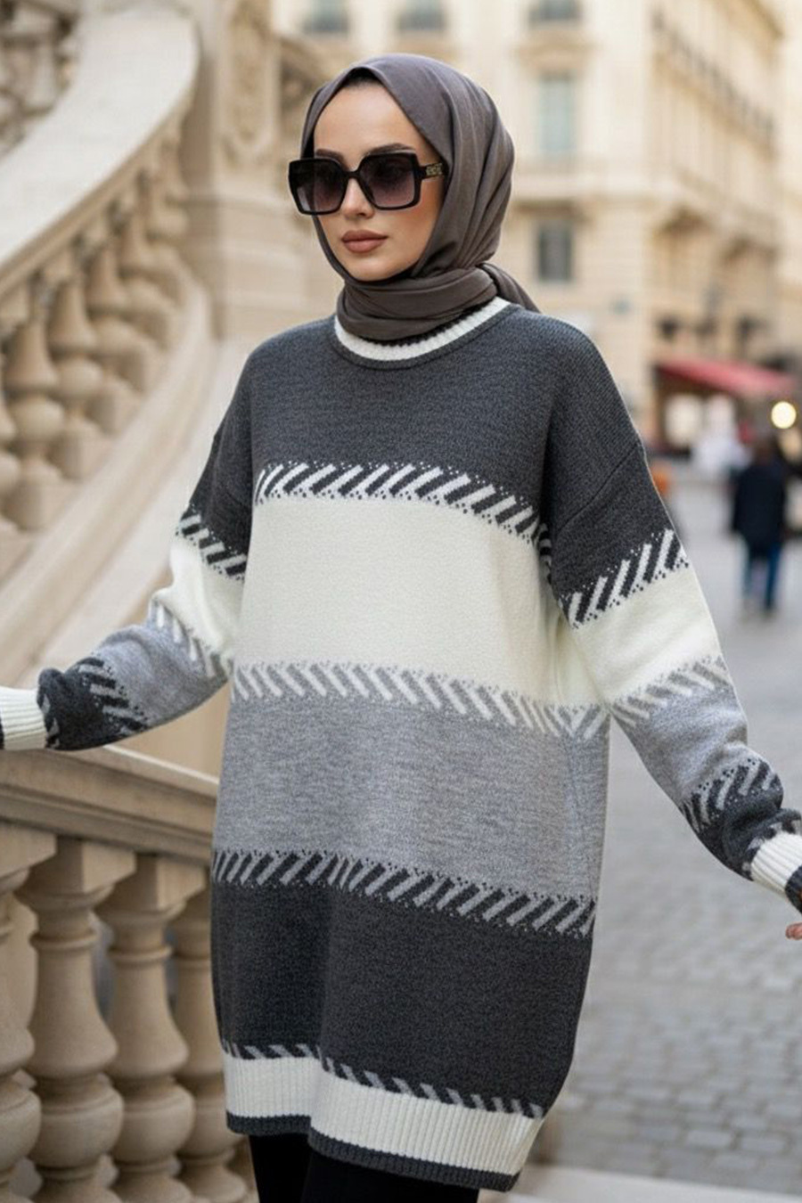 Blok Renkli Gri Tesettür Triko Kazak Tunik 88101GR