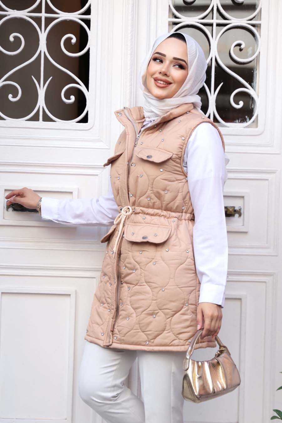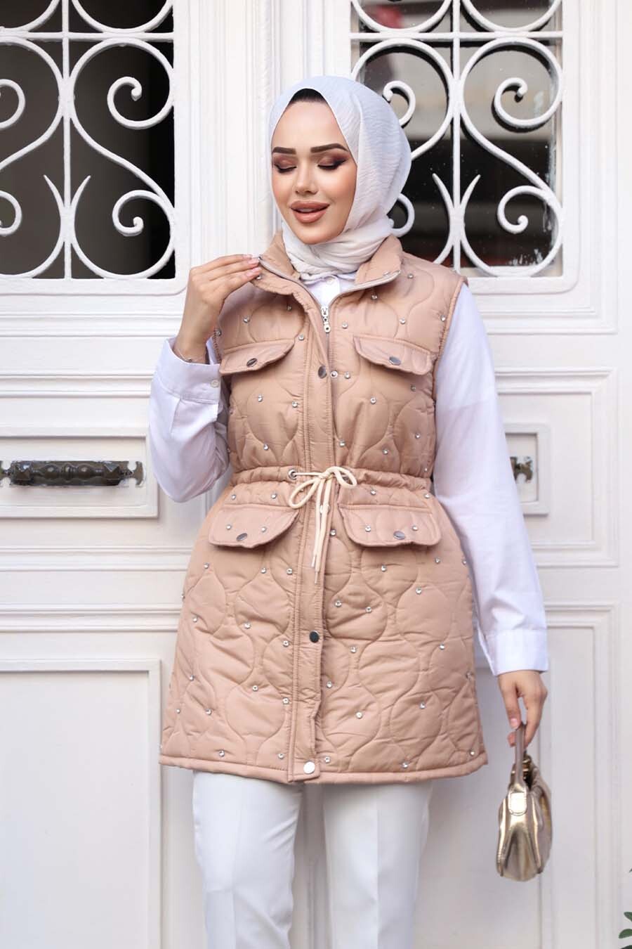 Ürün Özelliği: Dik yaka, sıfır kollu, cep detaylı, boncuk işlemeli, ön ortadan fermuarlı, düğme kapamalı ve belden bağcıklıdır.