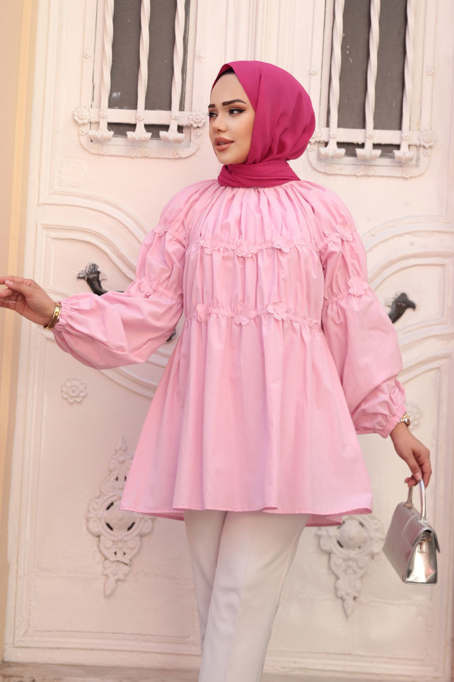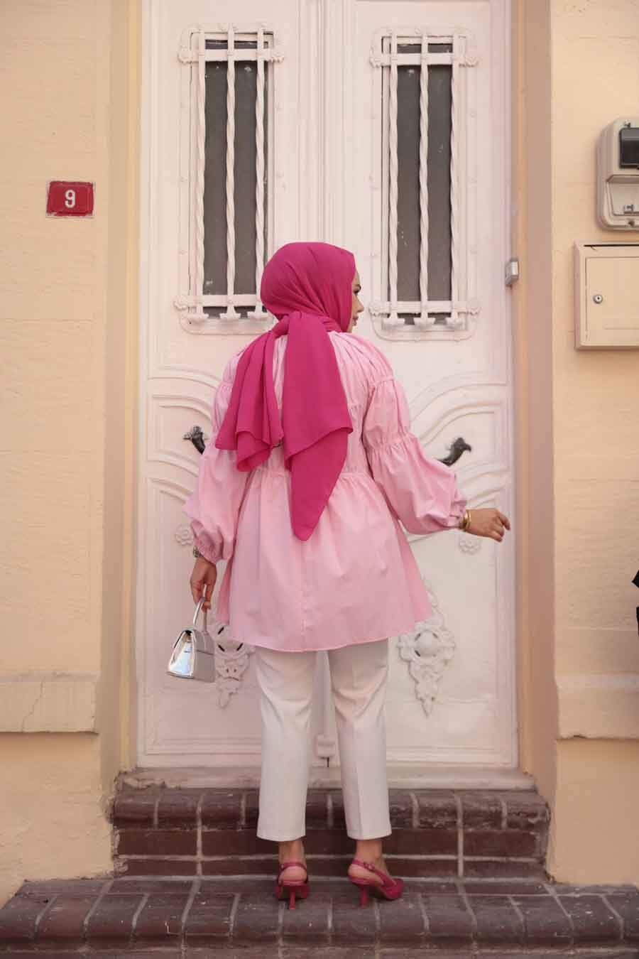 Büzgü Detaylı Pembe Tesettür Tunik 101033P