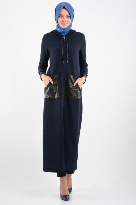 BY Kayalar - Deri Detaylı Lacivert TesettürPardesü 8581L