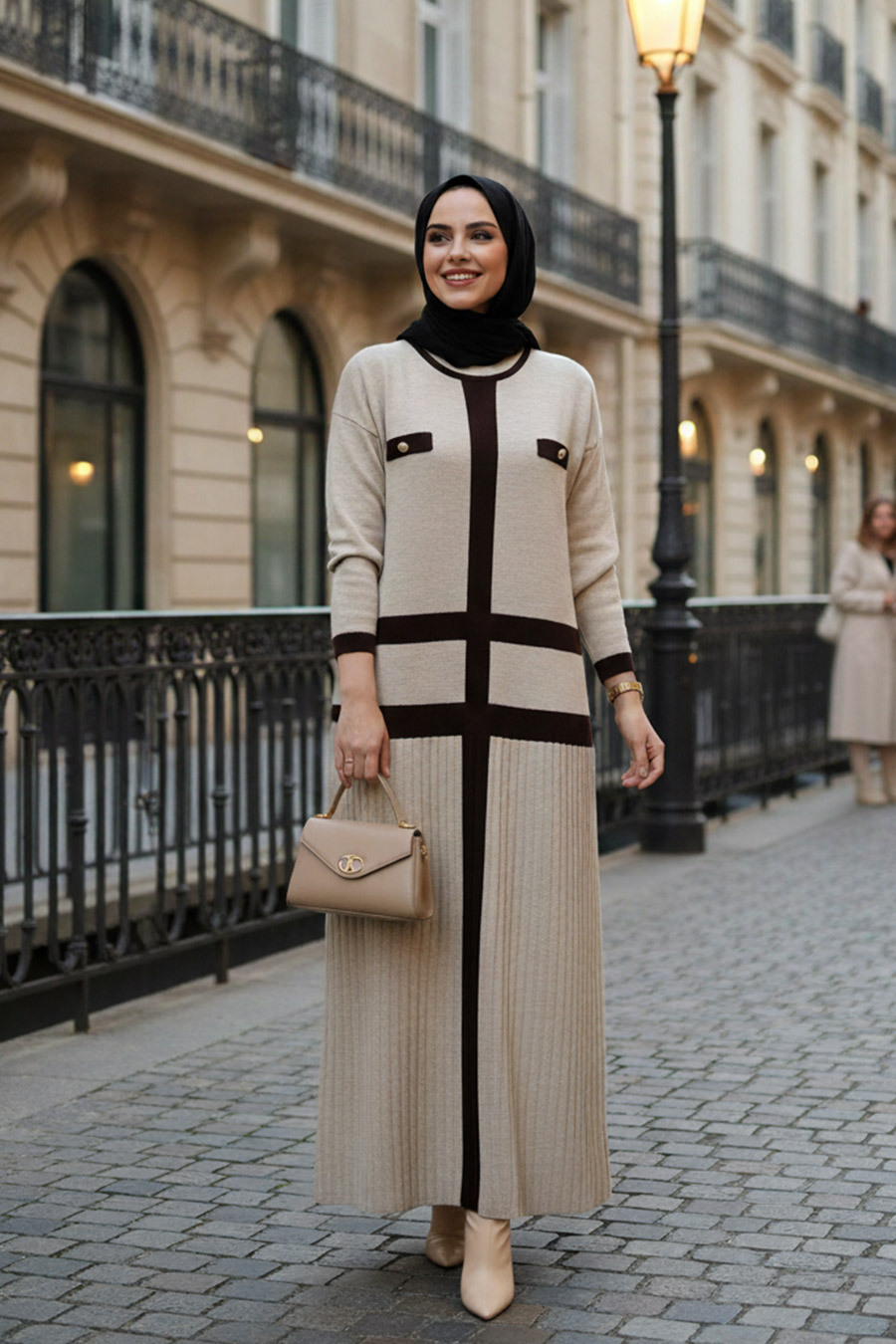 Ürün Özelliği: Sıfır yaka, uzun kollu, blok şerit detaylı, yanlardan cep detaylı ve eteği pilelidir.