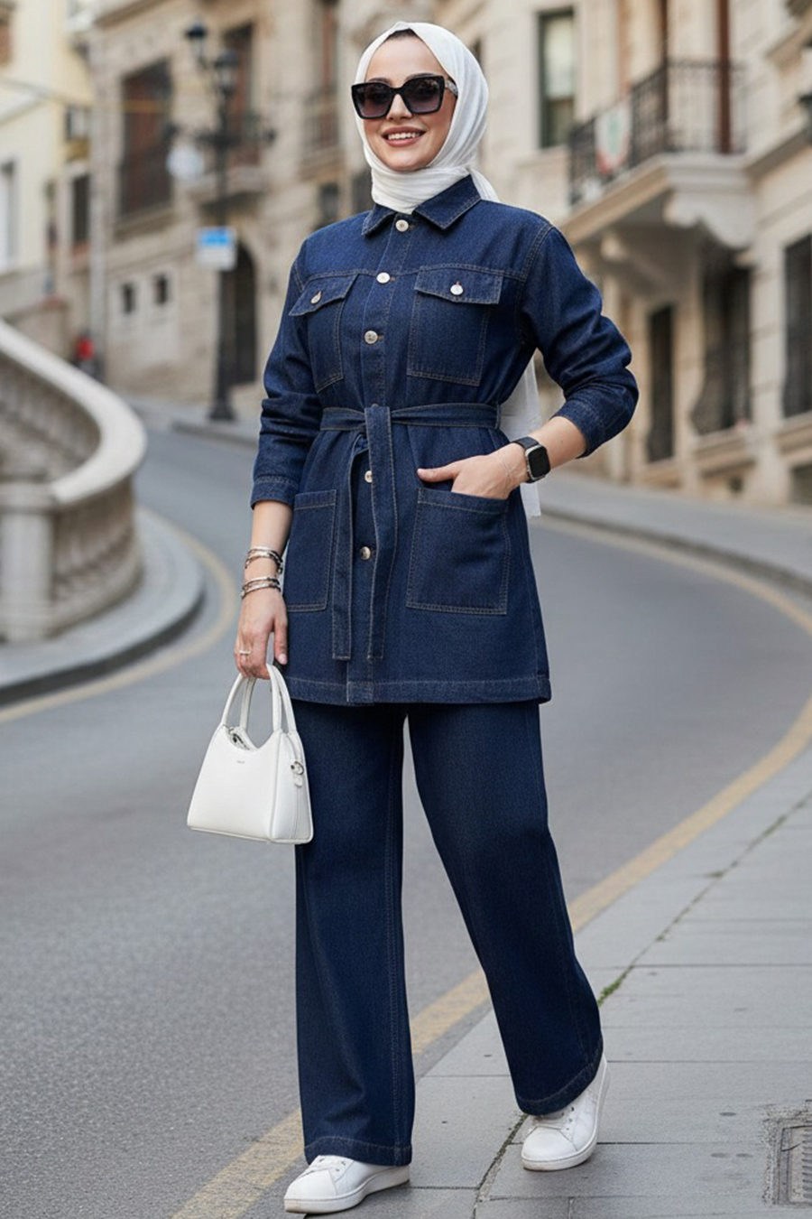 Ürün Özelliği: Klasik yaka, uzun kollu, manşetli, ön ortadan düğmeli, yanlardan cepli, kendi kumaşından kemerli, pantolon belden lastikli ve boru paçadır.