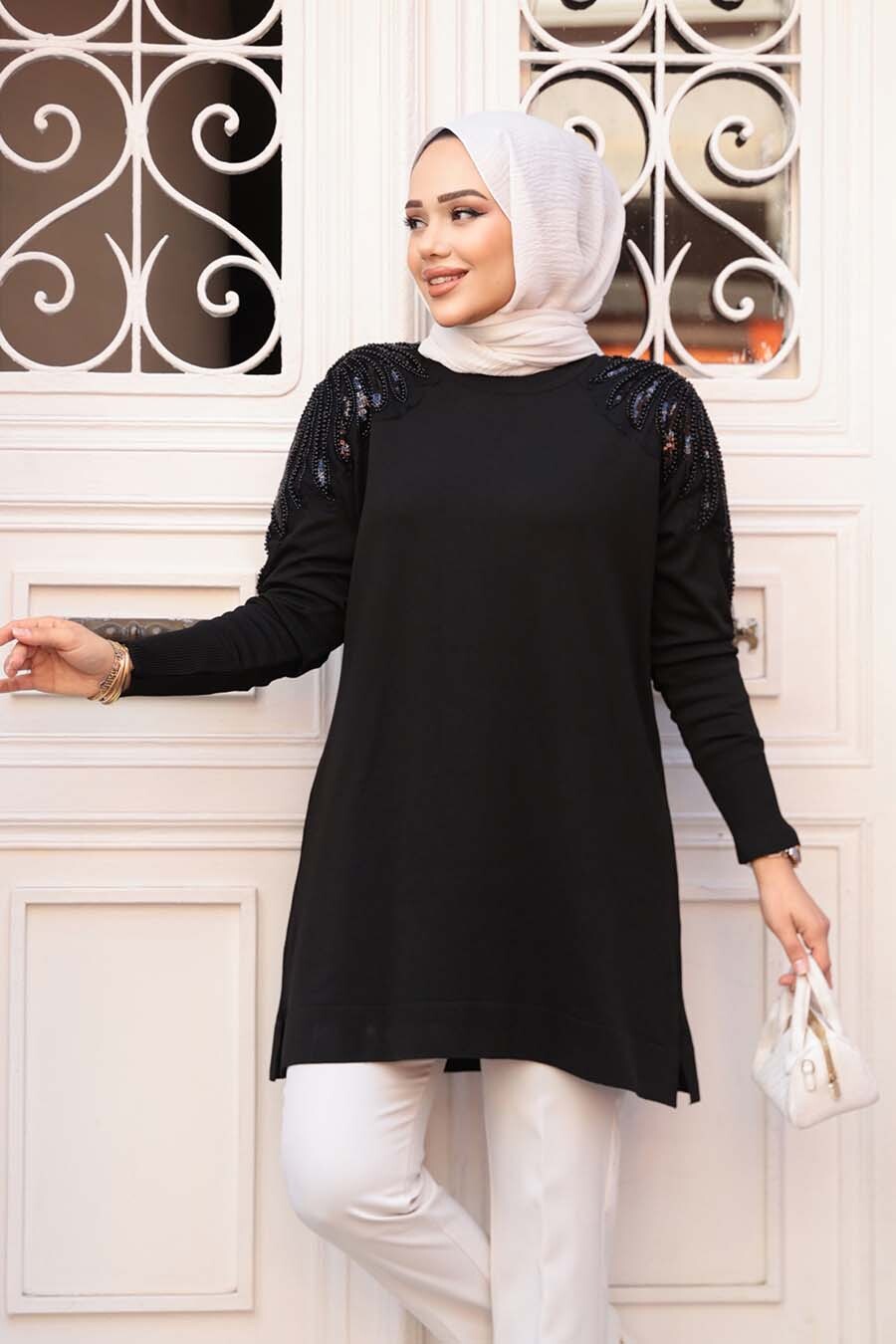 Ürün Özelliği: Sıfır yaka, uzun kollu, kol ucu lastikli, omuzları boncuk işleme detaylı, etek ucu yırtmaç detaylıdır.