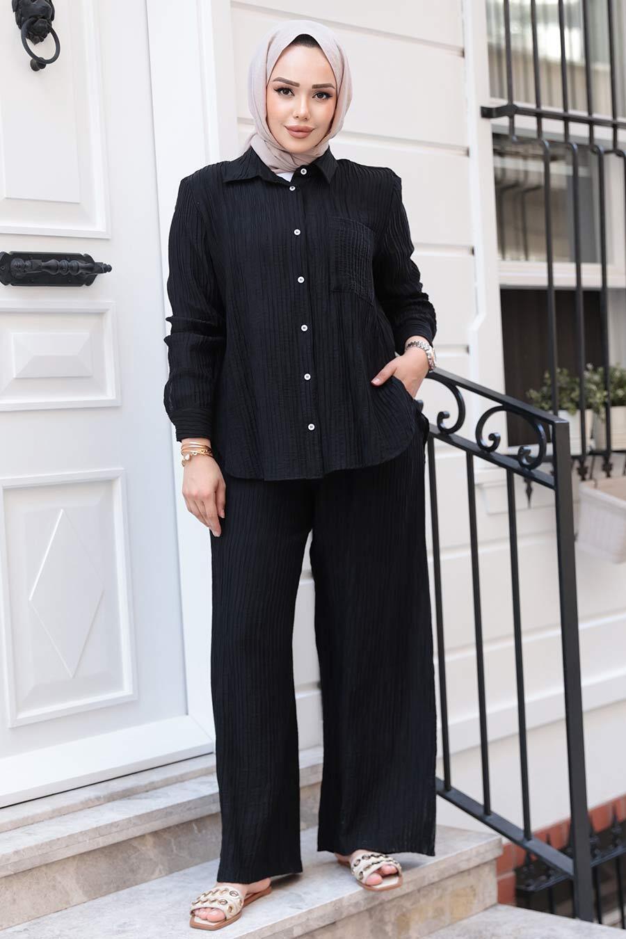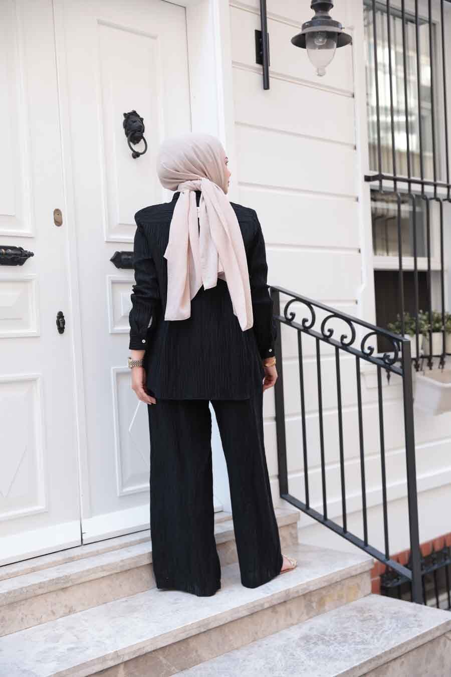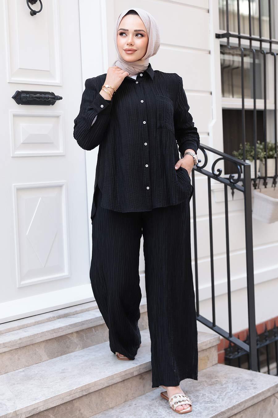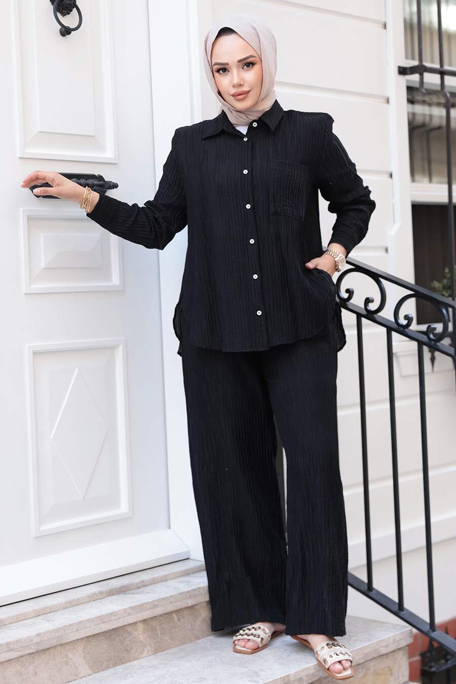 Ürün Özelliği:Klasik yaka, uzun kollu, manşetli, cep detaylı, ön ortadan düğmeli, çizgi detaylı, pantolon belden lastikli, yanlardan cepli ve geniş paçadır.