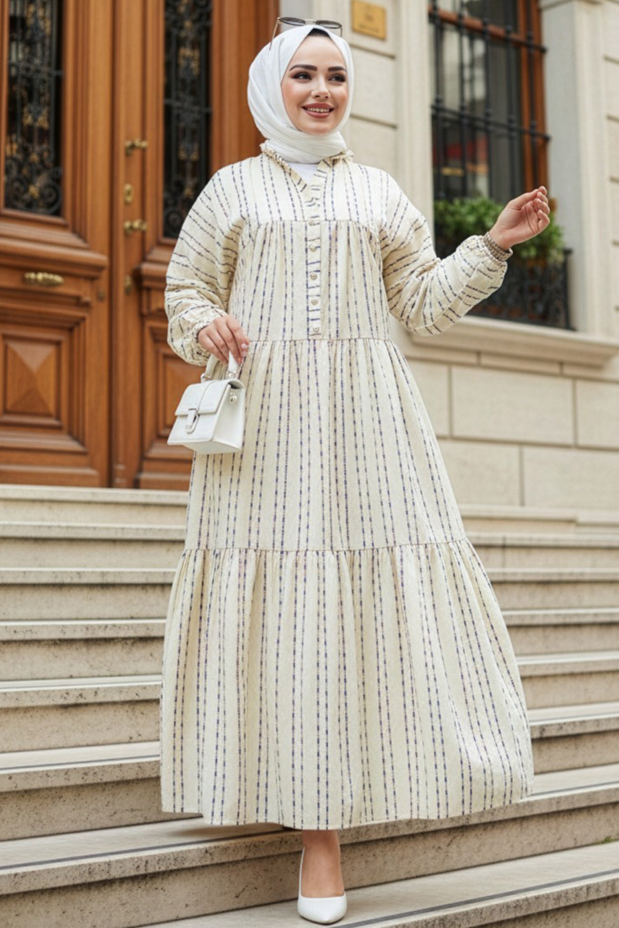 Ürün Özelliği:V yaka, uzun kollu, kol ucu lastikli, ön ortadan düğmeli, kat piliseli ve çizgilidir.