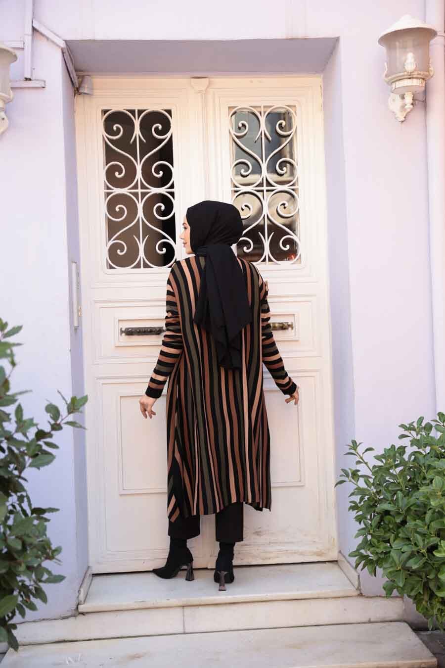 Ürün Özelliği: Boğazlı yaka, uzun kollu, çizgili ve etek ucu yırtmaçlıdır.