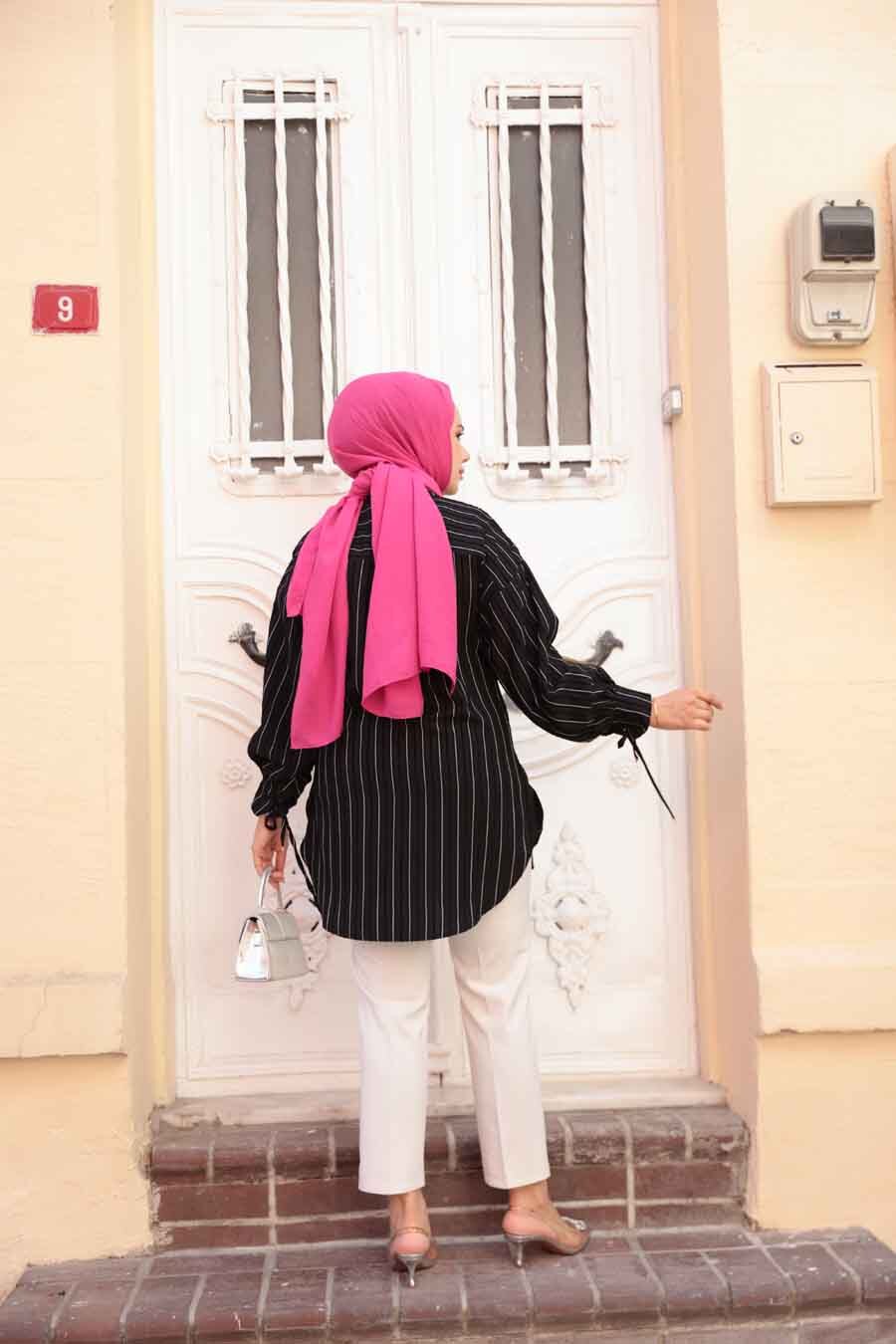 Klasik yaka, uzun kollu, kol ucu bağcıklı, çizgili ve ön ortadan düğmelidir.