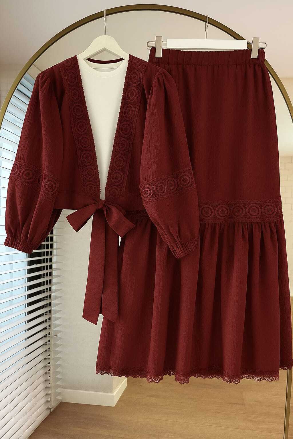 Dantel Detaylı Bordo Tesettür Etekli İkili Takım 40201BR