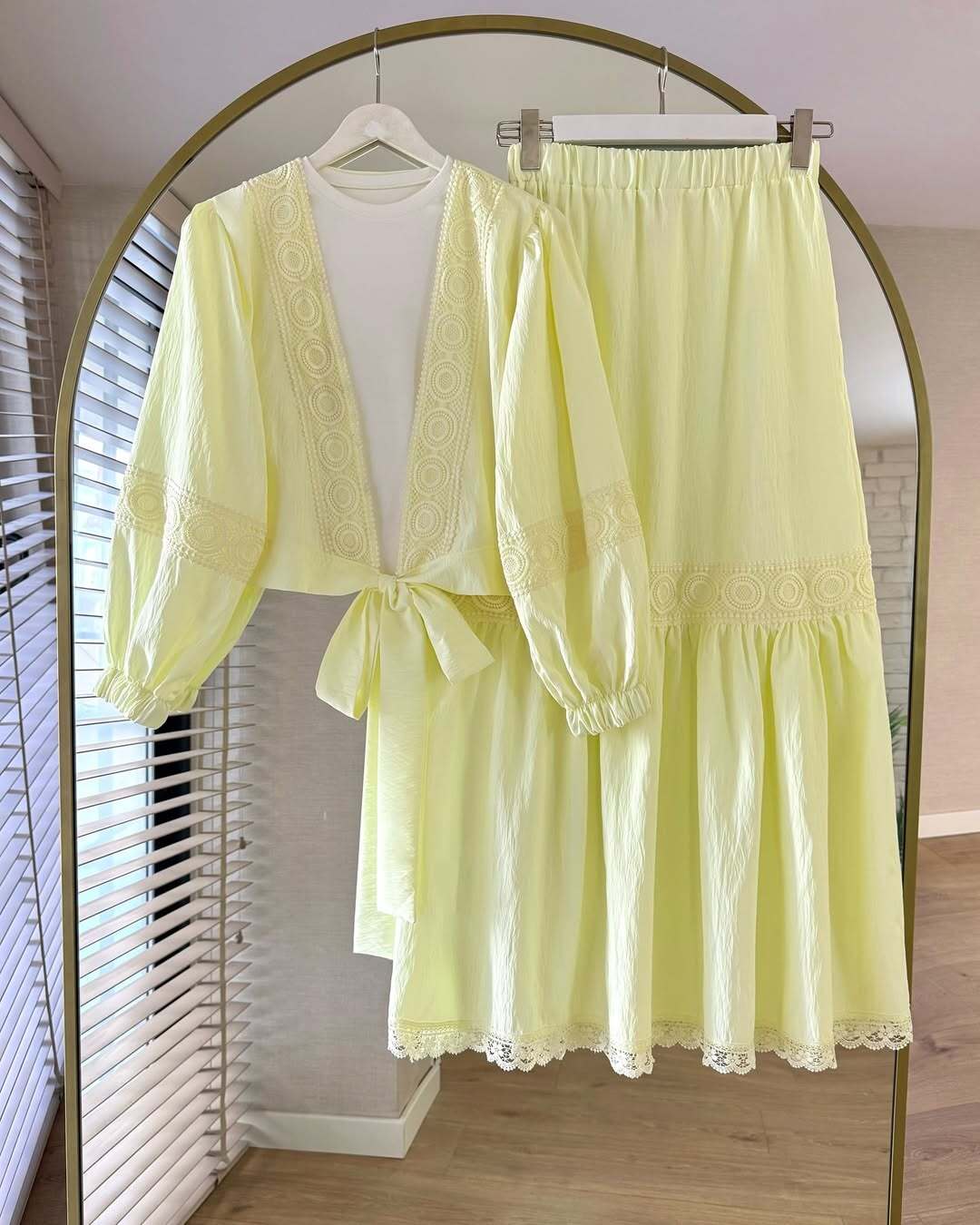 Dantel Detaylı Sarı Tesettür Etekli İkili Takım 40201SR