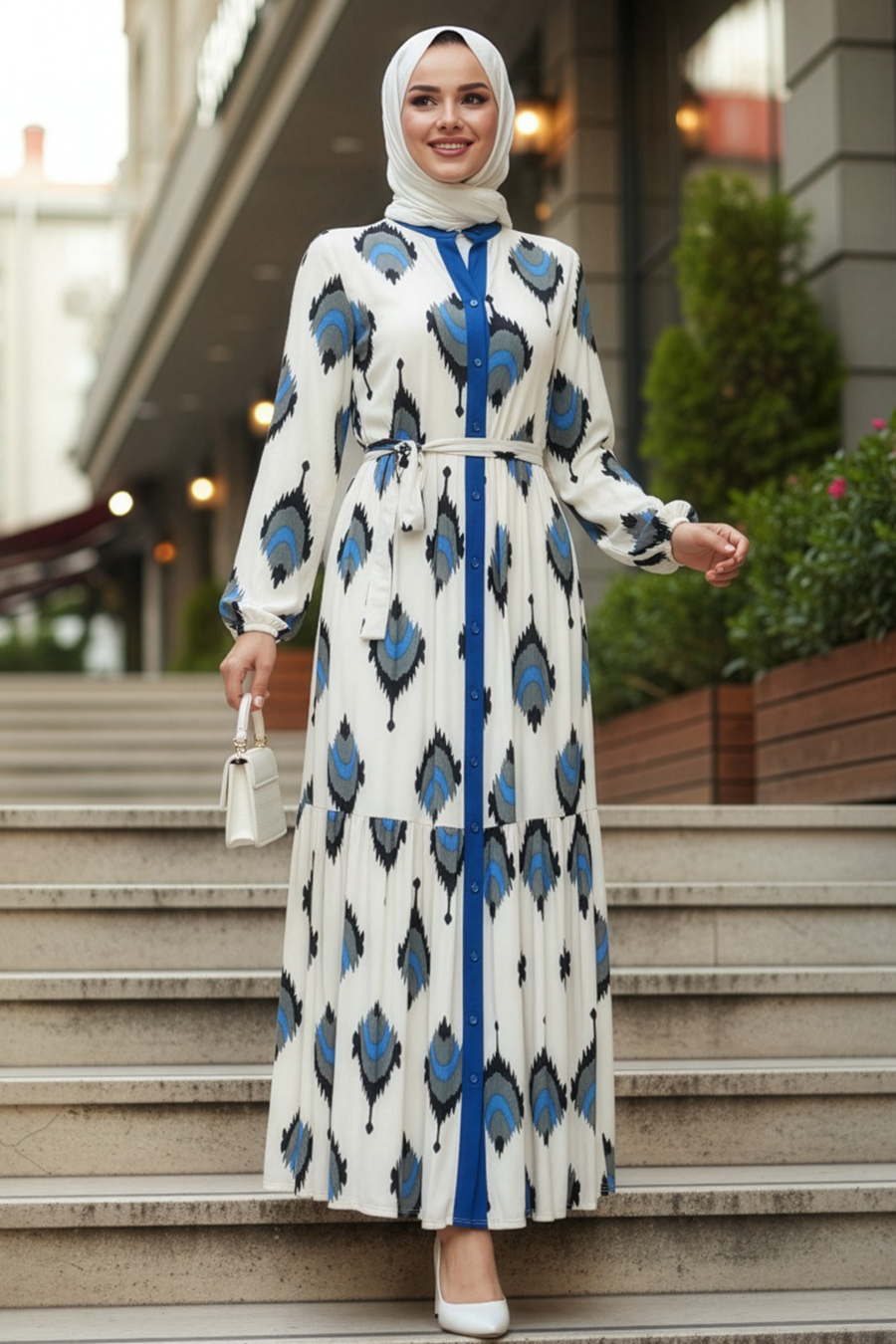 Ürün Özelliği: V yaka, uzun kollu, kol ucu lastikli, desenli, ön ortadan düğmeli, kendi kumaşından kemerli ve pilise detaylıdır.