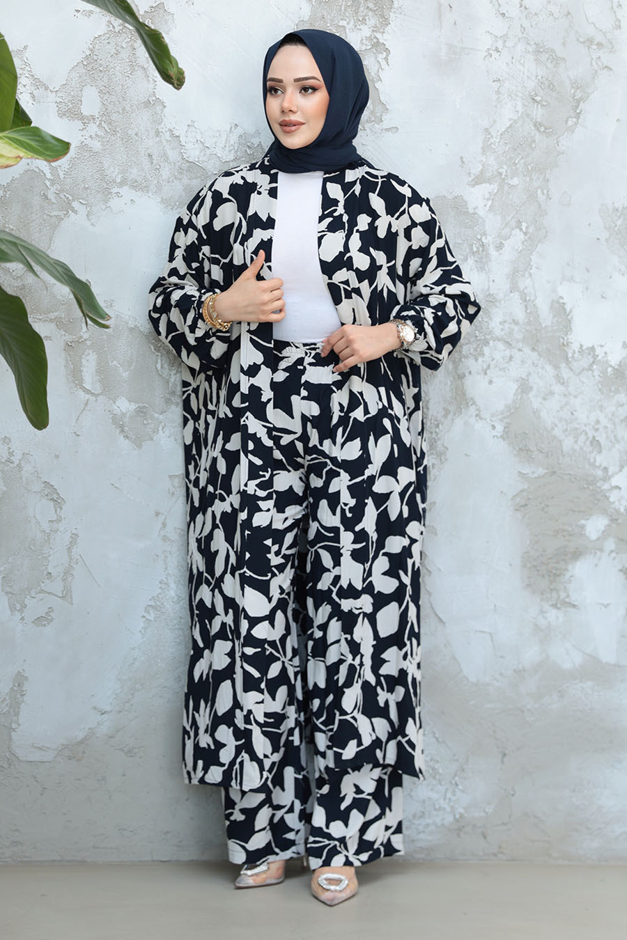 Ürün Özelliği: Sıfır yaka, uzun kollu, kol ucu lastikli, desenli, önü açık, pantolon belden lastikli, desenli ve geniş paçadır.