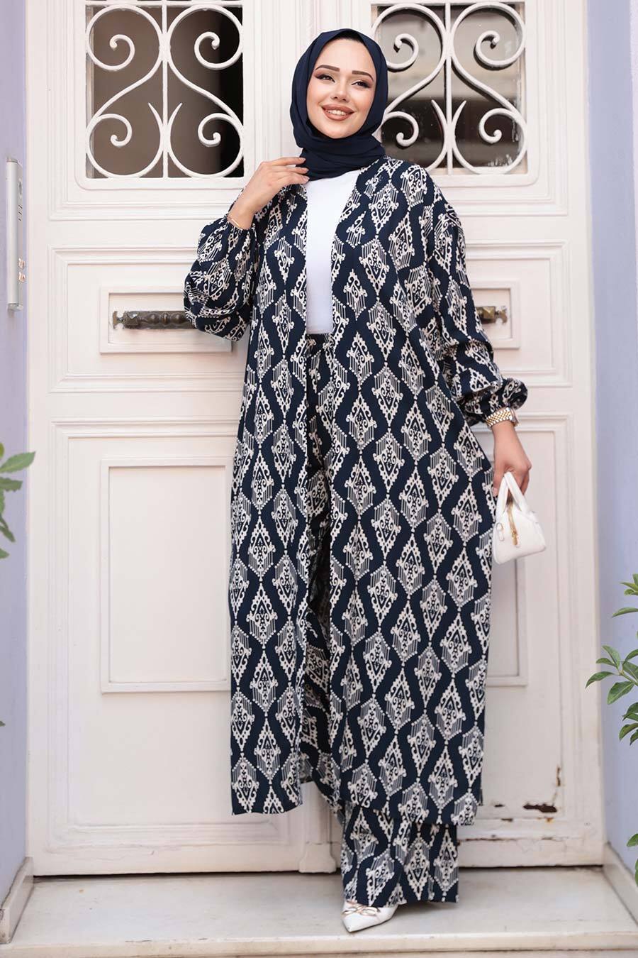 Ürün Özelliği: V yaka, uzun kollu, kendi kumaşından kemerli, desenli, pantolon belden lastikli ve geniş paçadır.