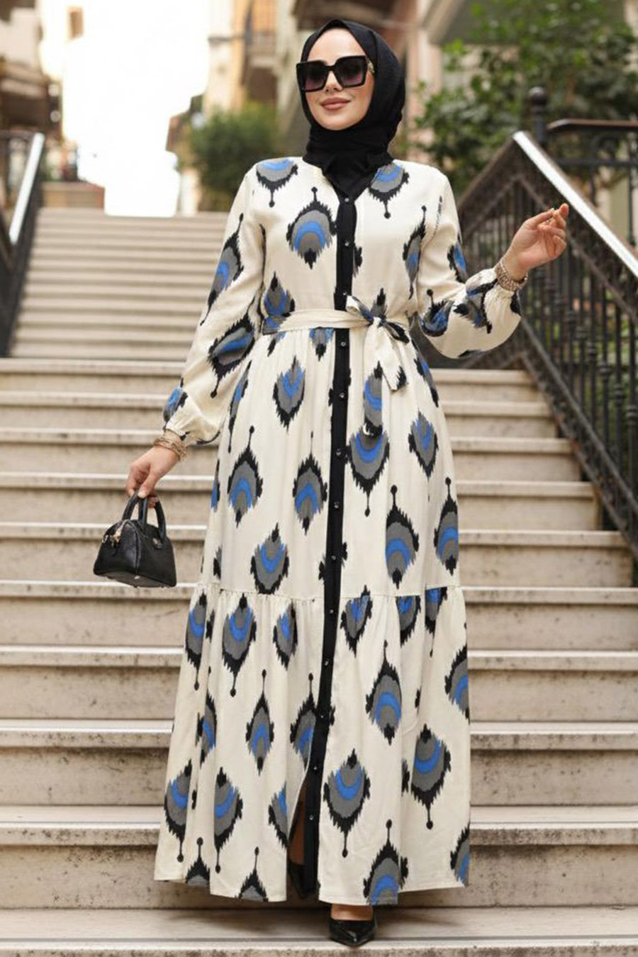 Ürün Özelliği: V yaka, uzun kollu, kol ucu lastikli, desenli, ön ortadan düğmeli, kendi kumaşından kemerli ve pilise detaylıdır.