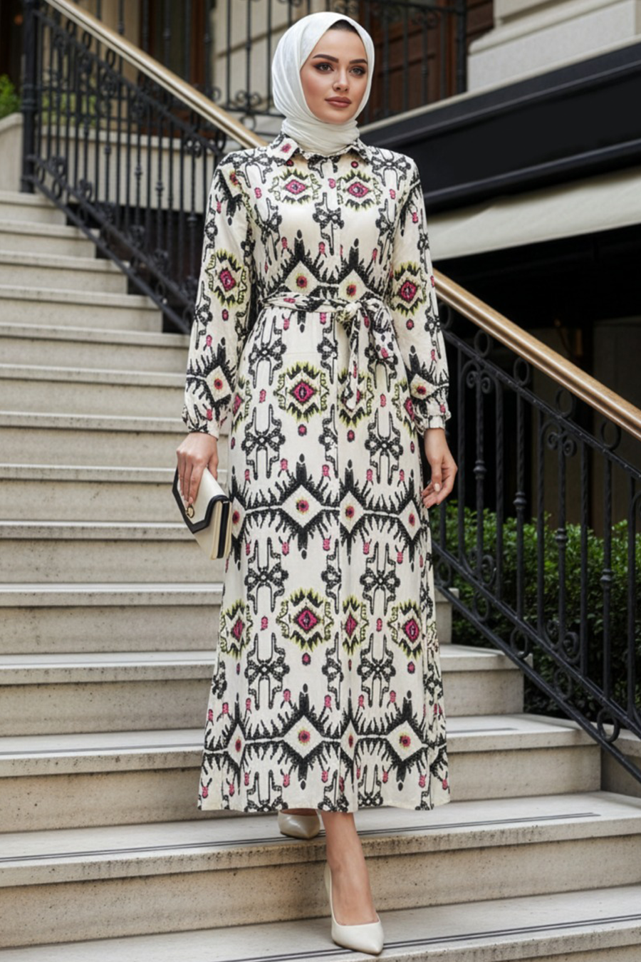 Ürün Özelliği:Klasik yaka, uzun kollu, kol ucu lastikli, kendi kumaşından kemerli, desenli ve ön ortadan düğmelidir.