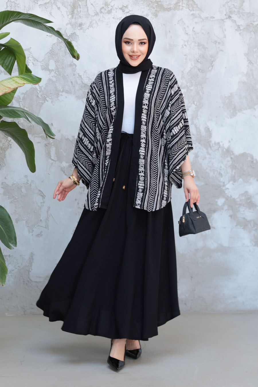 Ürün Özelliği: Sıfır yaka, uzun kollu, yarasa kol, desenli, önü açık, etek belden lastikli ve kloş kesimdir.