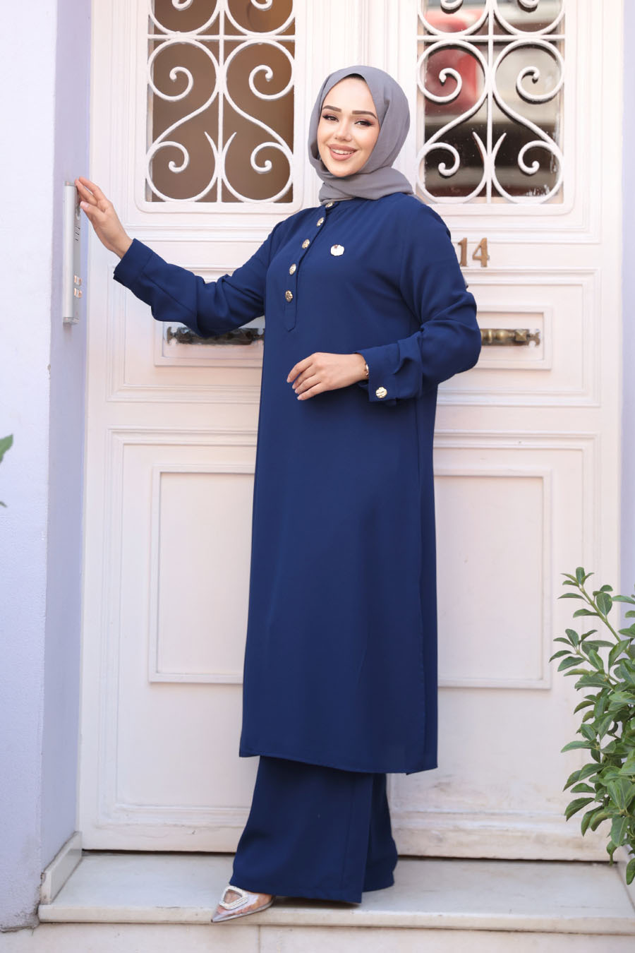 Ürün Özelliği: Sıfır yaka, uzun kollu, manşetli, ön ortadan düğme detaylı, etek ucu yırtmaç detaylı, pantolon belden lastikli ve geniş paçadır.