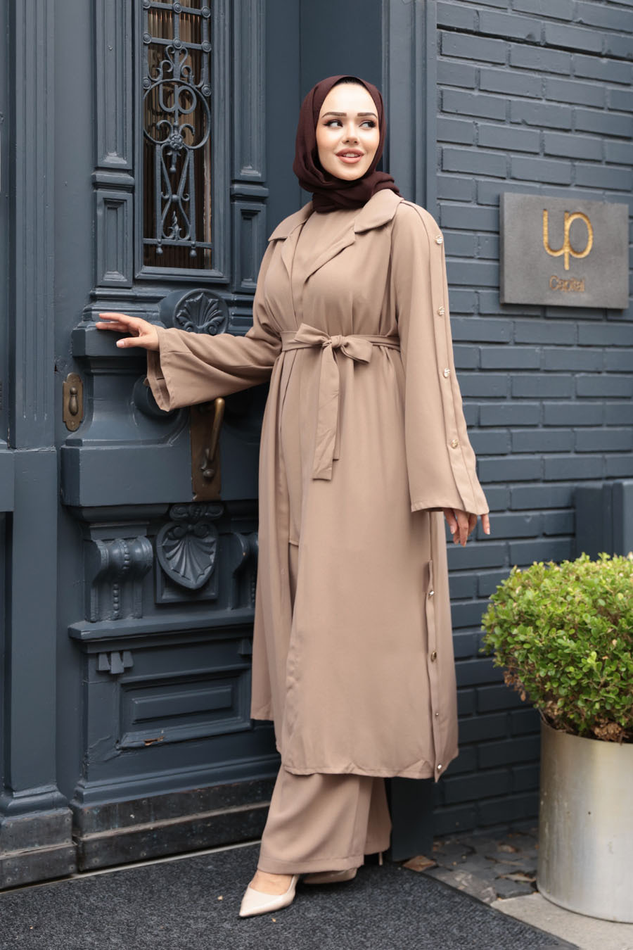 Ürün Özelliği: Klasik yaka, uzun kollu, düğme detaylı, kendi kumaşından kemerli, içlikli, pantolon belden lastikli ve boru paçadır.