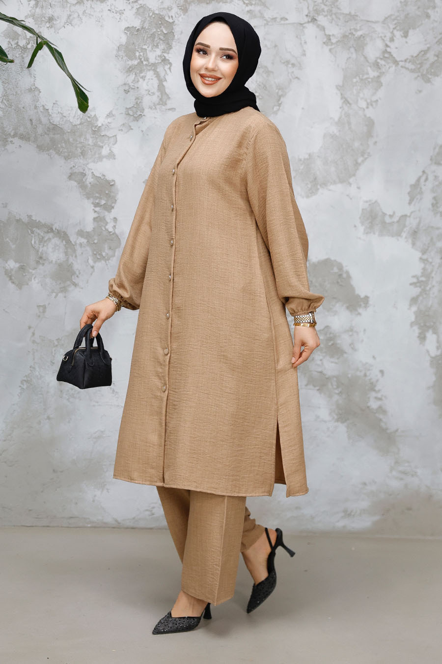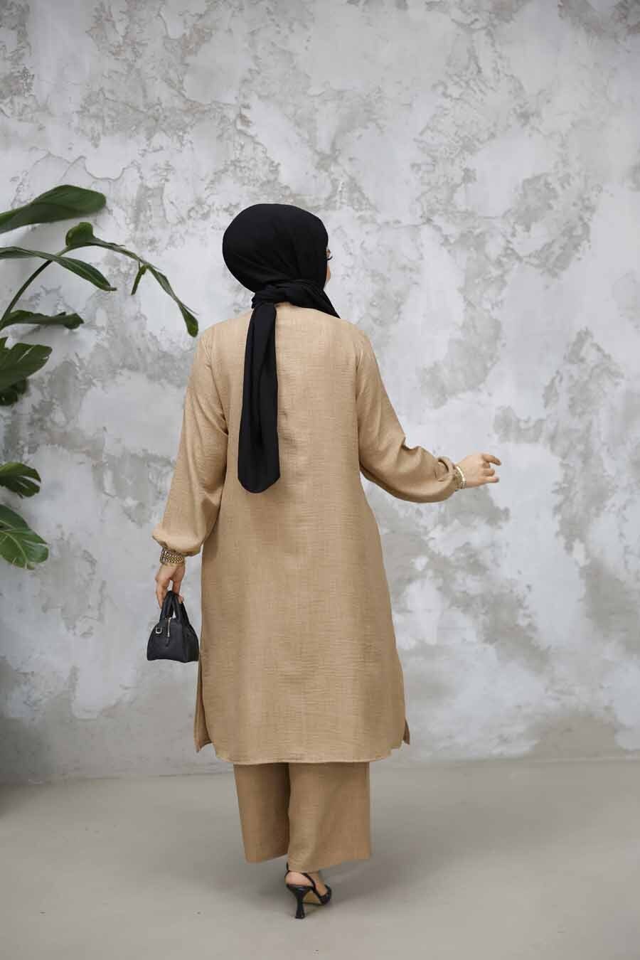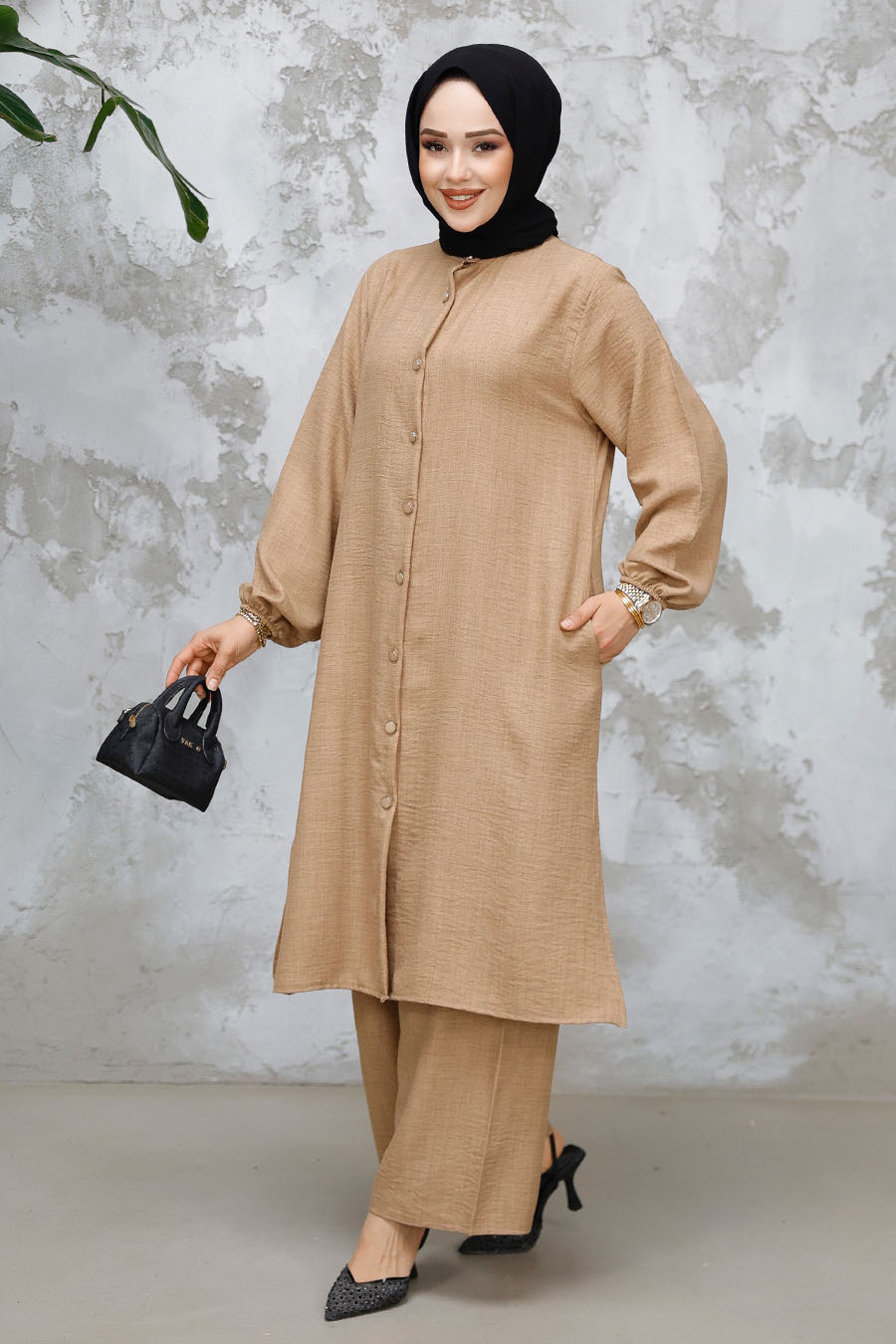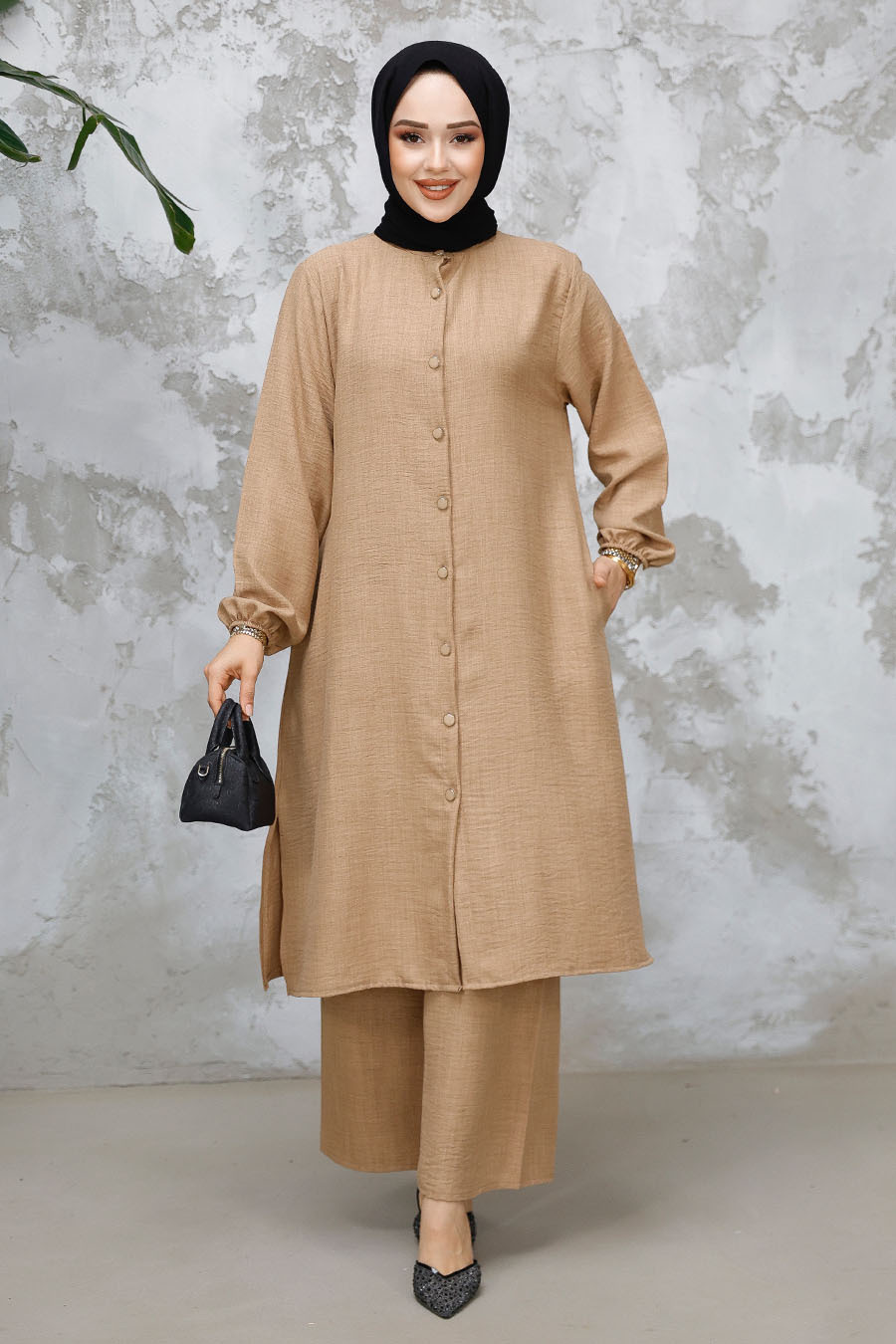 Ürün Özelliği: Sıfır yaka, uzun kollu, kol ucu lastikli, yanlardan cepli, ön ortadan düğmeli, etek ucu yırtmaç detaylı, pantolon belden lastikli ve geniş paçadır.