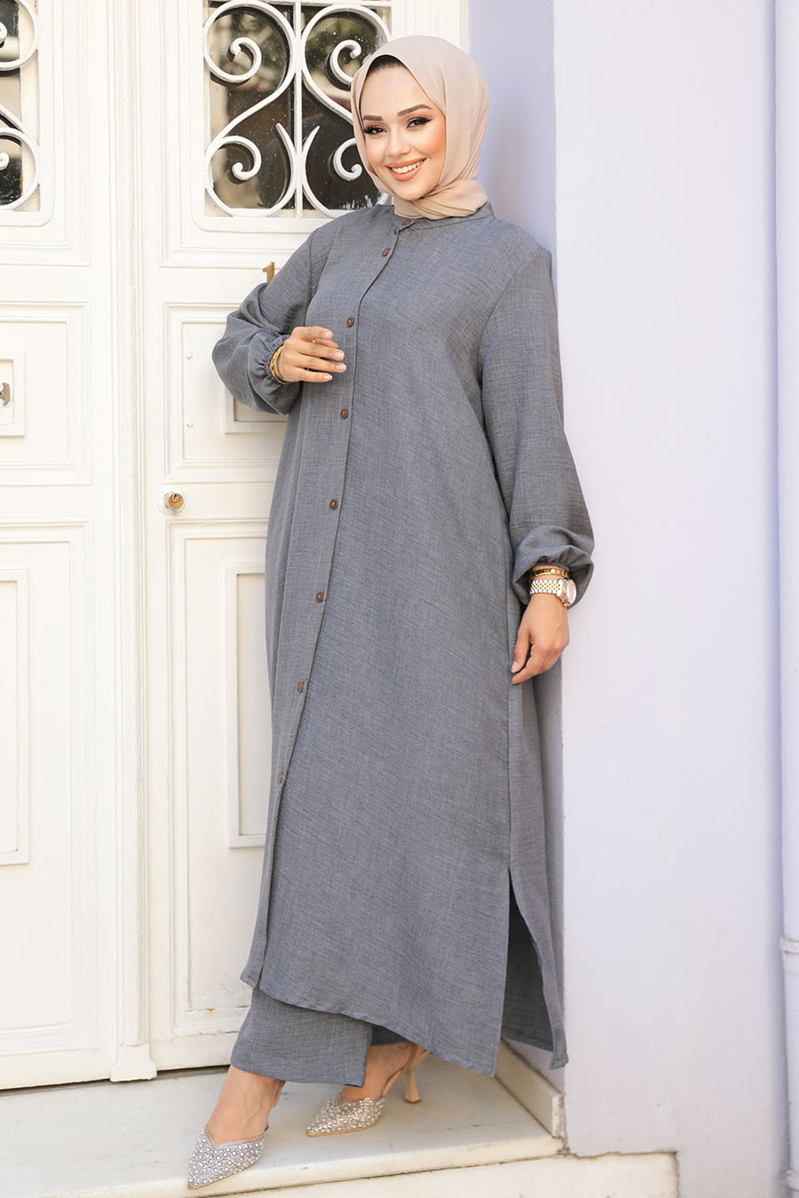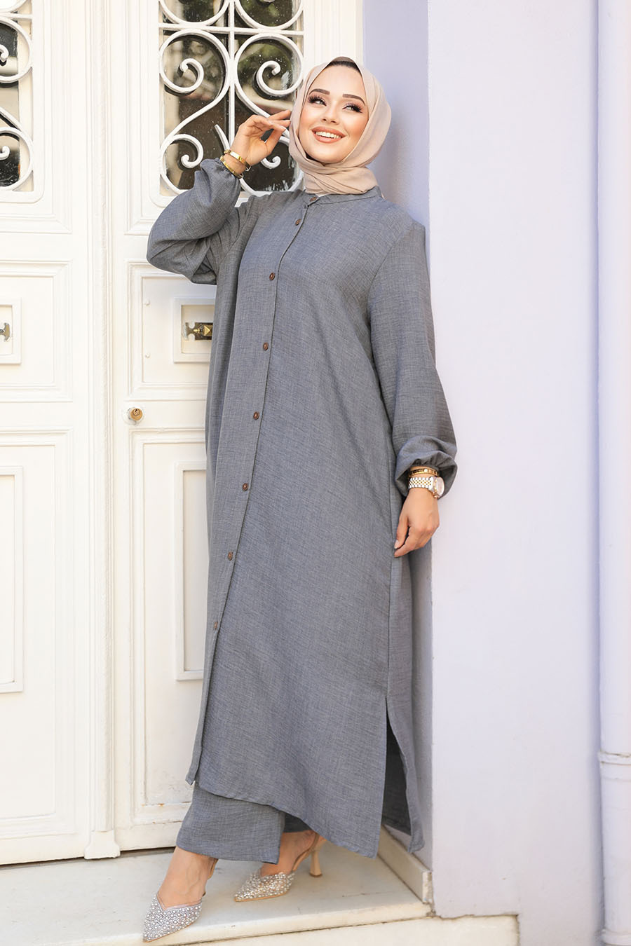 Ürün Özelliği: Sıfır yaka, uzun kollu, kol ucu lastikli, ön ortadan düğmeli, etek ucu yırtmaçlı, pantolon belden lastikli ve boru paçadır.