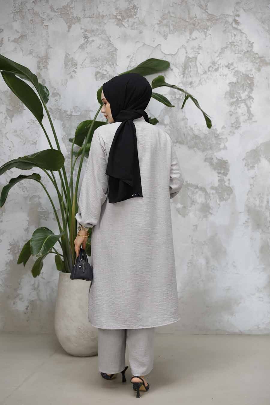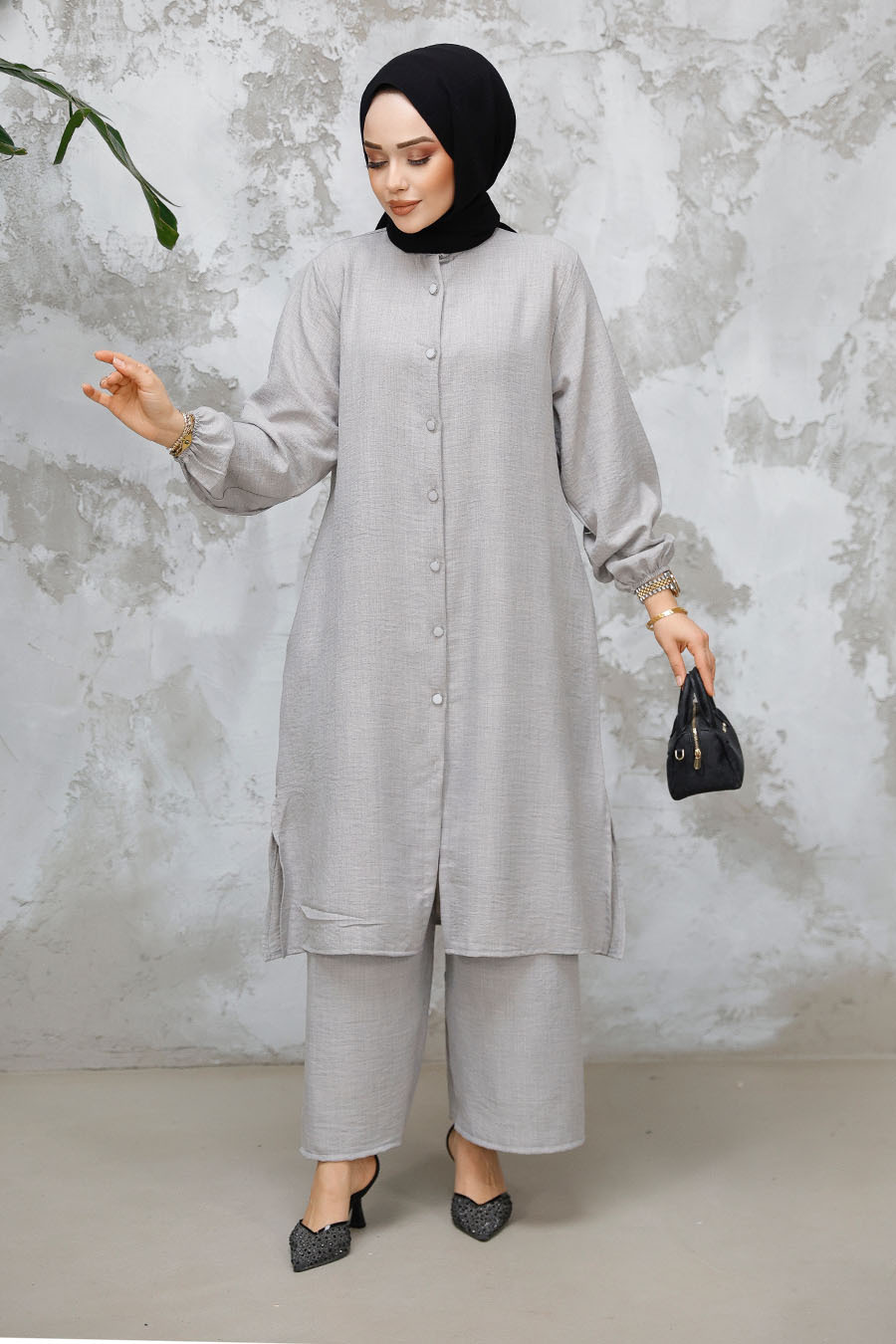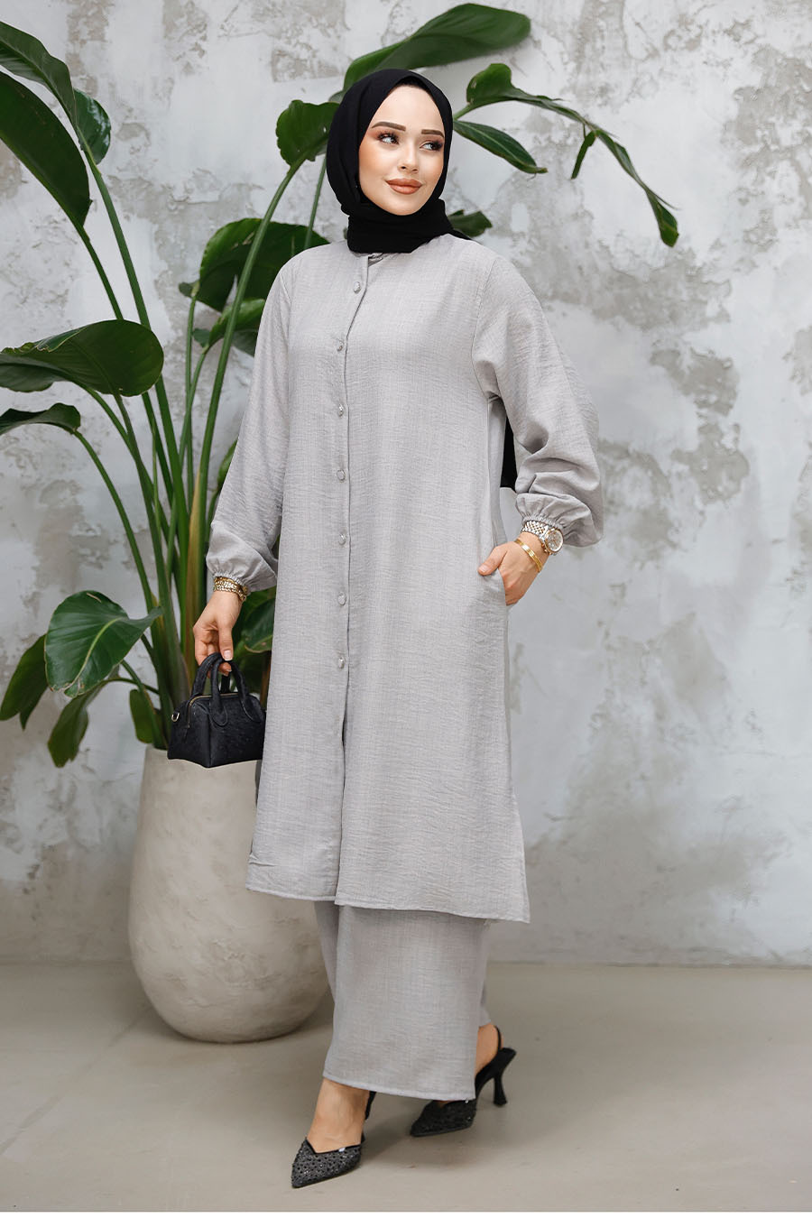 Ürün Özelliği: Sıfır yaka, uzun kollu, kol ucu lastikli, yanlardan cepli, ön ortadan düğmeli, etek ucu yırtmaç detaylı, pantolon belden lastikli ve geniş paçadır.