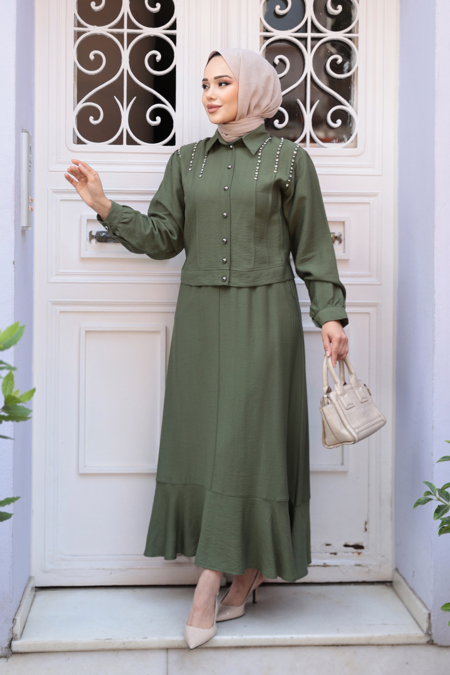 Düğmeli Haki Tesettür Etekli İkili Takım 44741HK