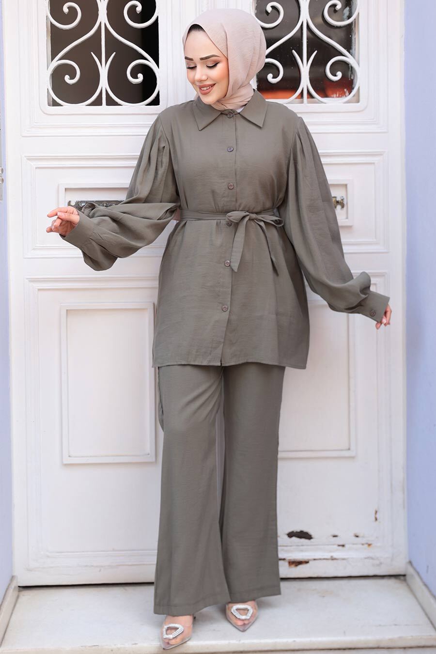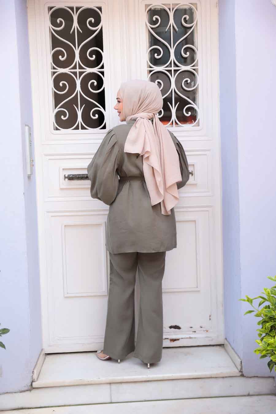 Ürün Özelliği: Klasik yaka, uzun kollu, manşetli, ön ortadan düğmeli, kendi kumaşından kemerli, pantolon belden lastikli ve boru paçadır.