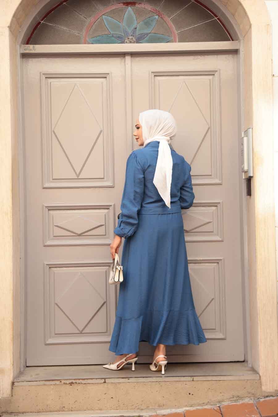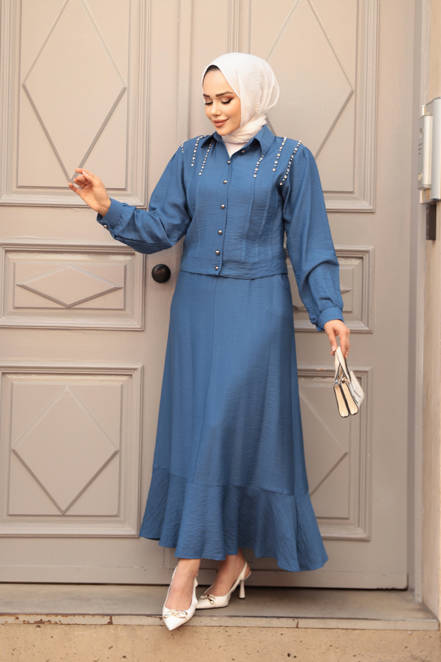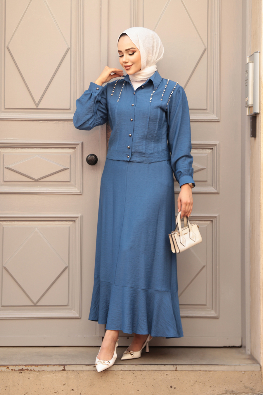 Düğmeli İndigo Mavisi Tesettür Etekli İkili Takım 44741IM