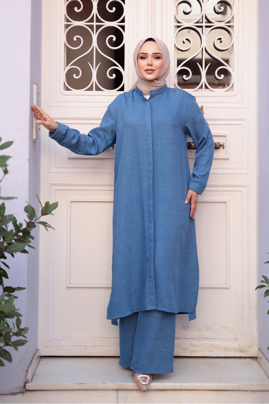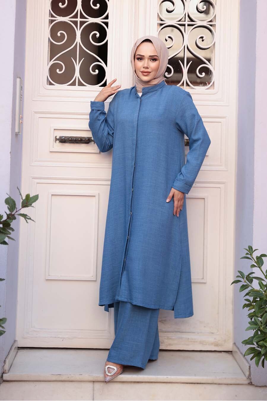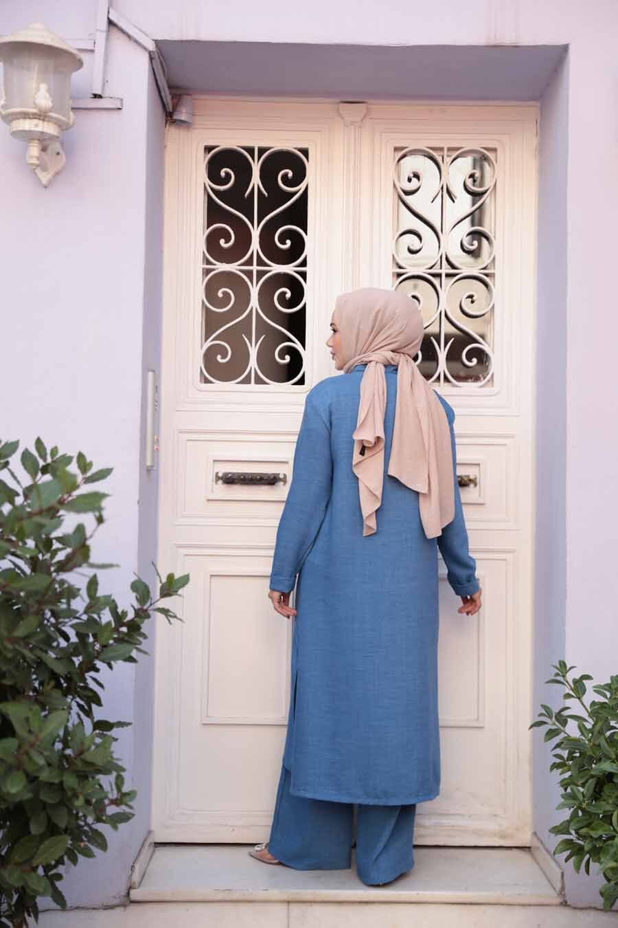 Ürün Özelliği:Dik yaka, uzun kollu, ön ortadan gizli düğme kapamalı, içlikli, pantolon belden lastikli ve geniş paçadır. Ürün Boyu:Üst:120 cm Alt:110 cm