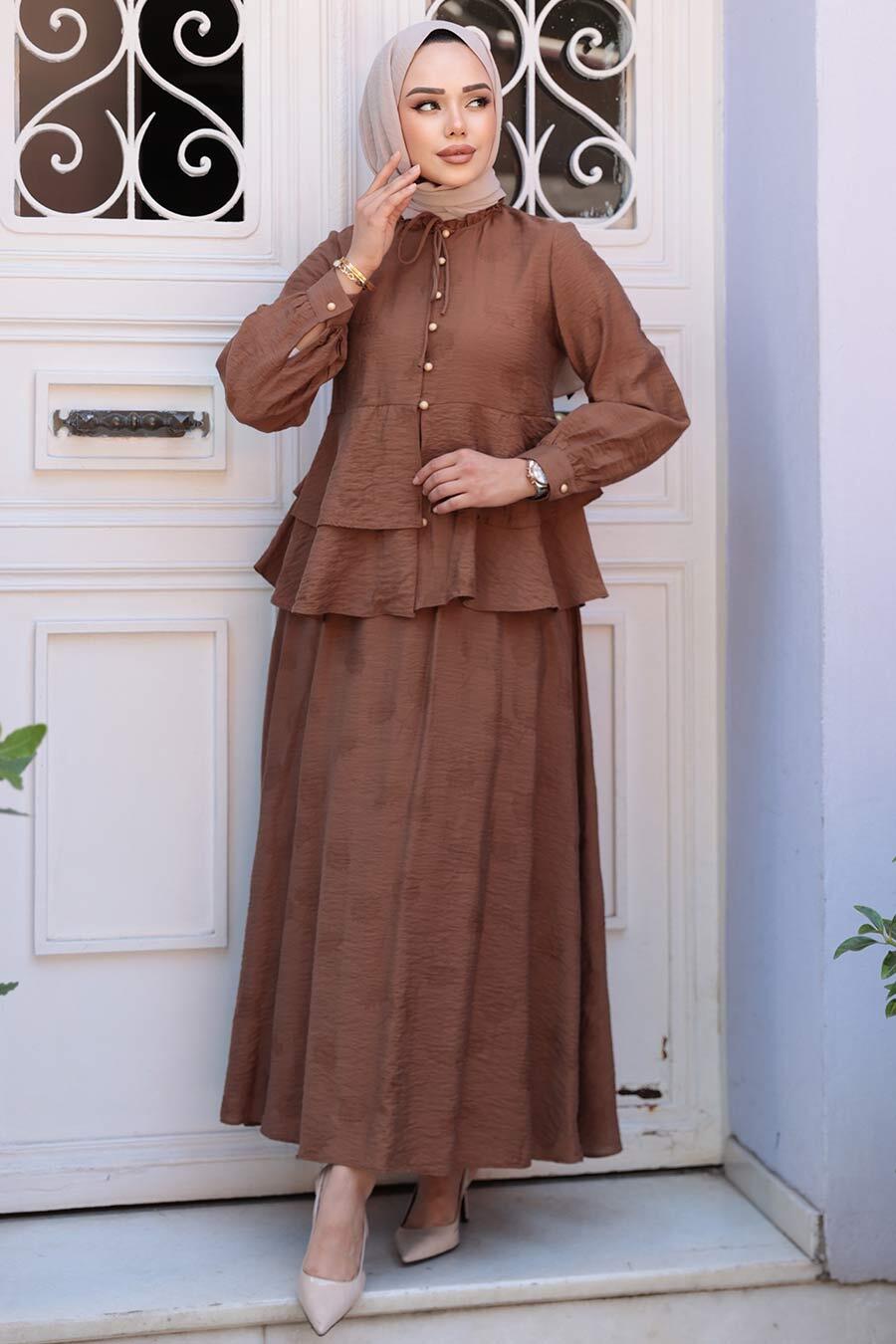 Düğmeli Kahverengi Tesettür Etekli İkili Takım 14334KH