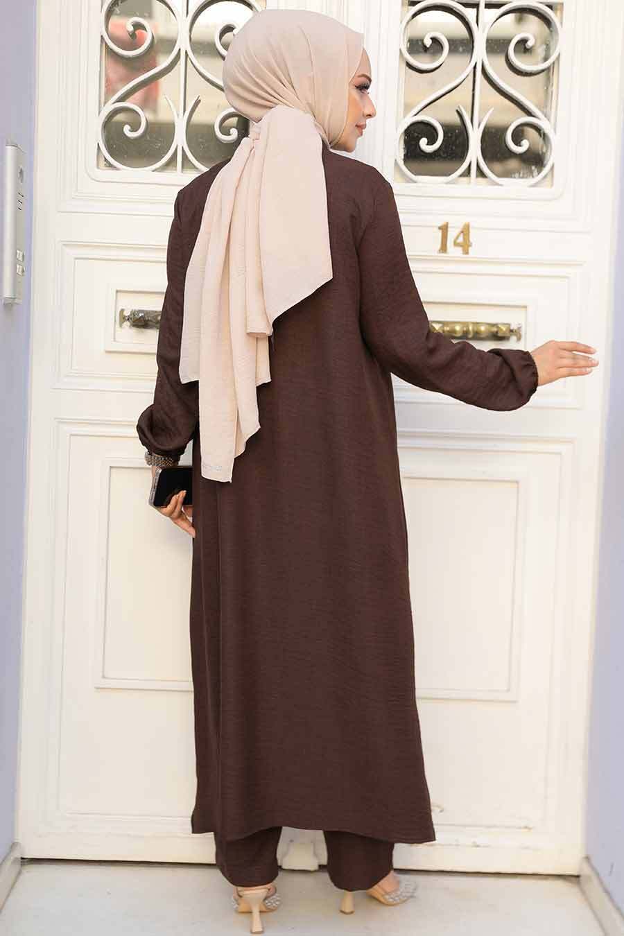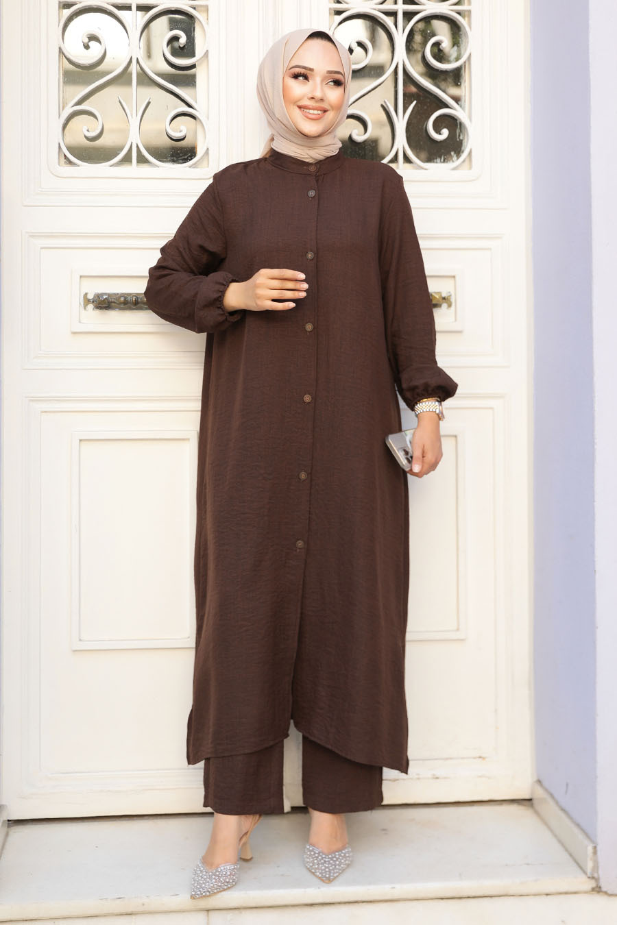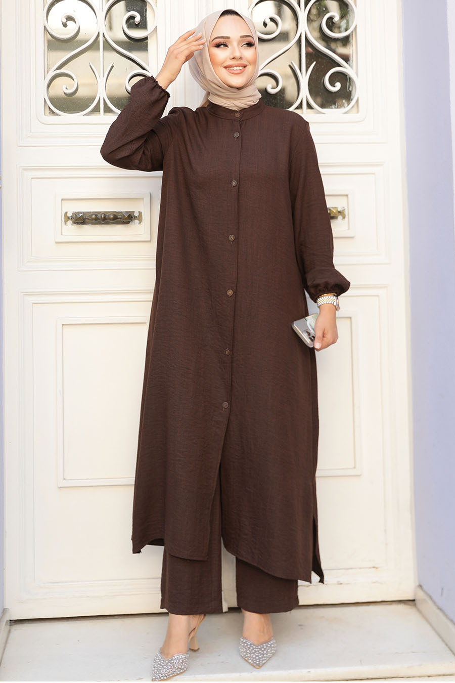 Ürün Özelliği: Sıfır yaka, uzun kollu, kol ucu lastikli, ön ortadan düğmeli, etek ucu yırtmaçlı, pantolon belden lastikli ve boru paçadır.