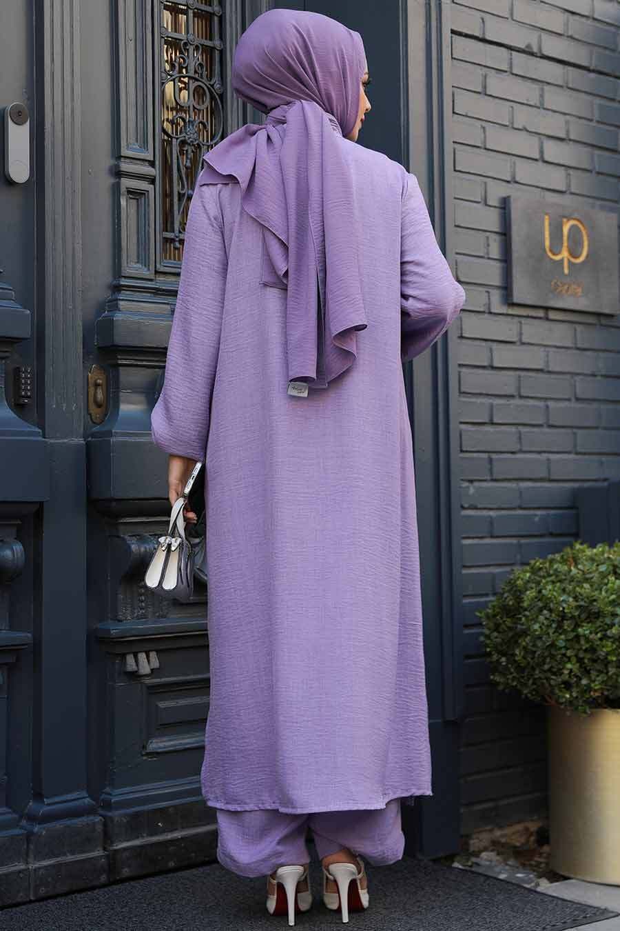 Ürün Özelliği: Sıfır yaka, uzun kollu, kol ucu lastikli, ön ortadan düğmeli, etek ucu yırtmaçlı, pantolon belden lastikli ve boru paçadır.