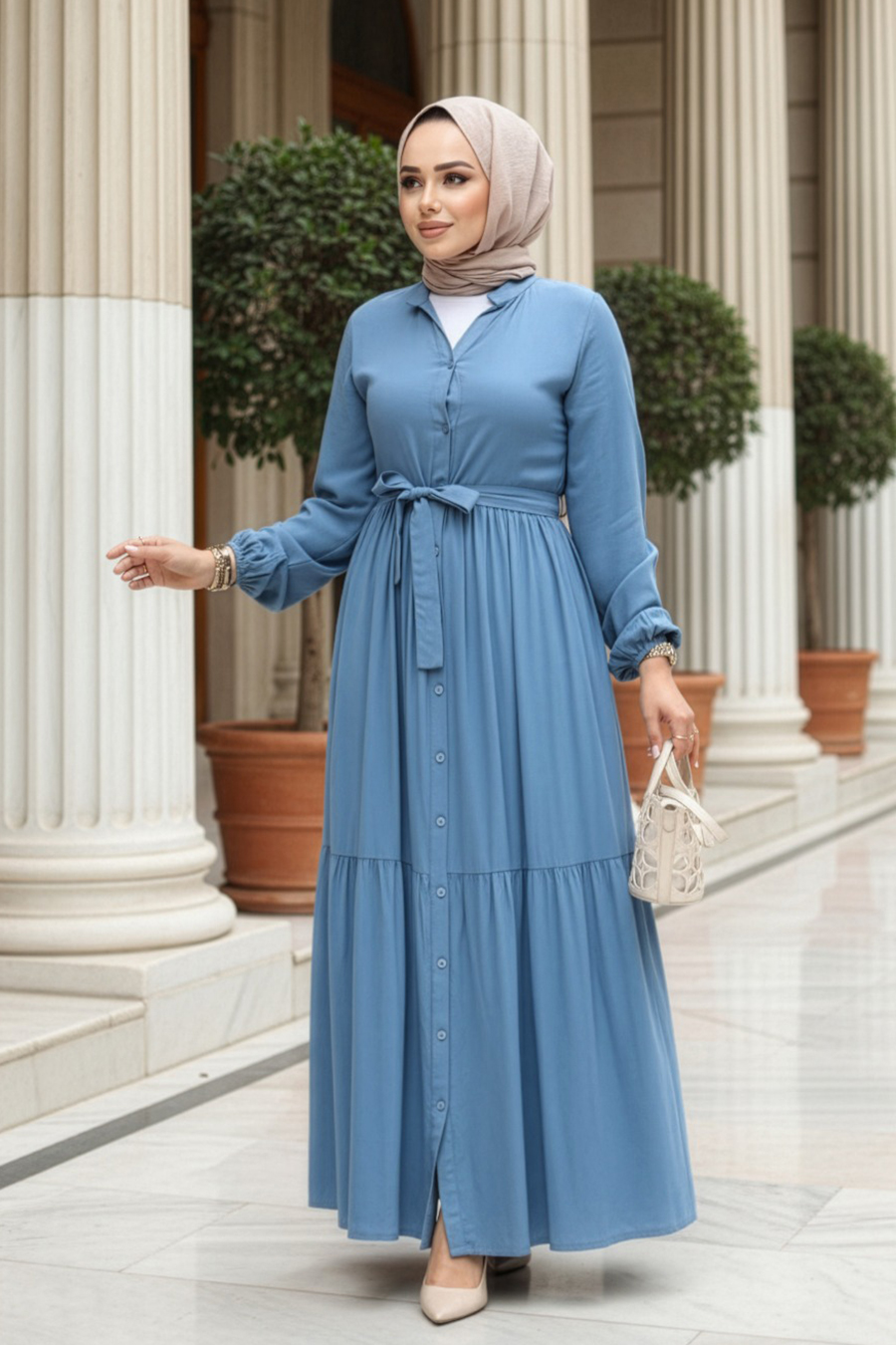 Kumaş Özelliği: Viskon kumaştan üretilmiştir. Ürün Özelliği: V yaka, uzun kollu, kol ucu lastikli, ön ortadan düğmeli, kat piliseli ve kendi kumaşından kemerlidir.