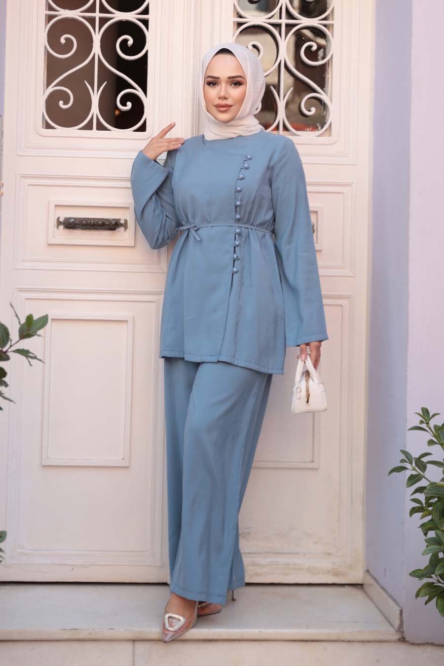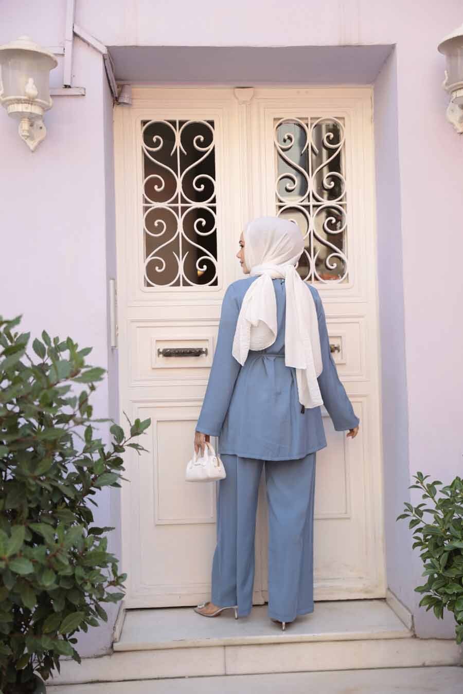 Ürün Özelliği: Sıfır yaka, uzun kollu, düğme kapamalı, ip kemerli, pantolon belden lastikli ve geniş paçadır. Ürün Boyu:Üst:82 cm Alt:110 cm