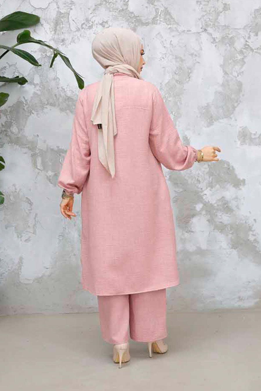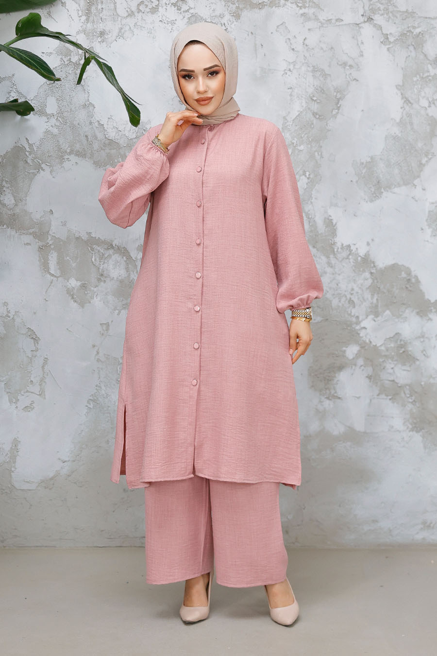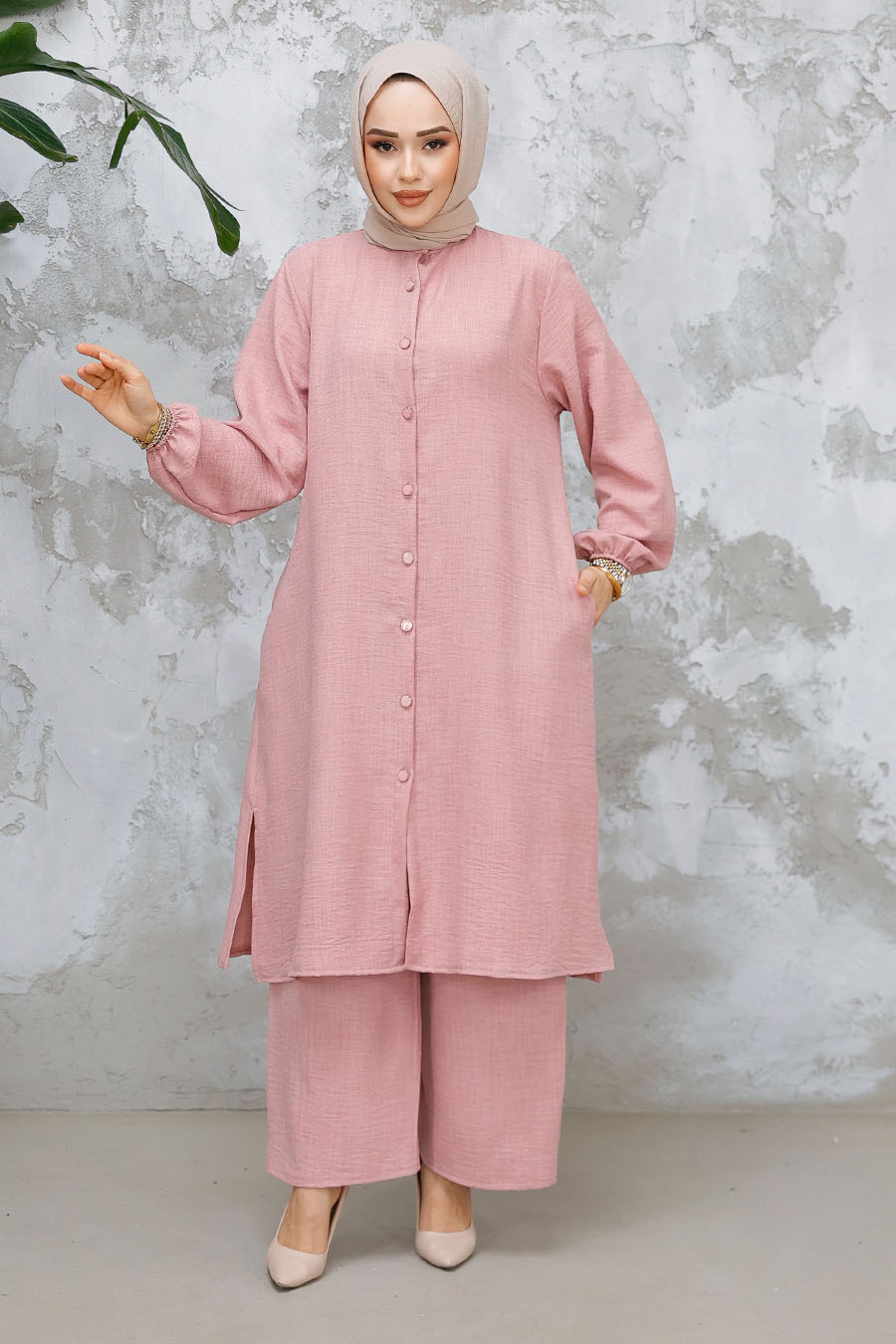 Ürün Özelliği: Sıfır yaka, uzun kollu, kol ucu lastikli, yanlardan cepli, ön ortadan düğmeli, etek ucu yırtmaç detaylı, pantolon belden lastikli ve geniş paçadır.