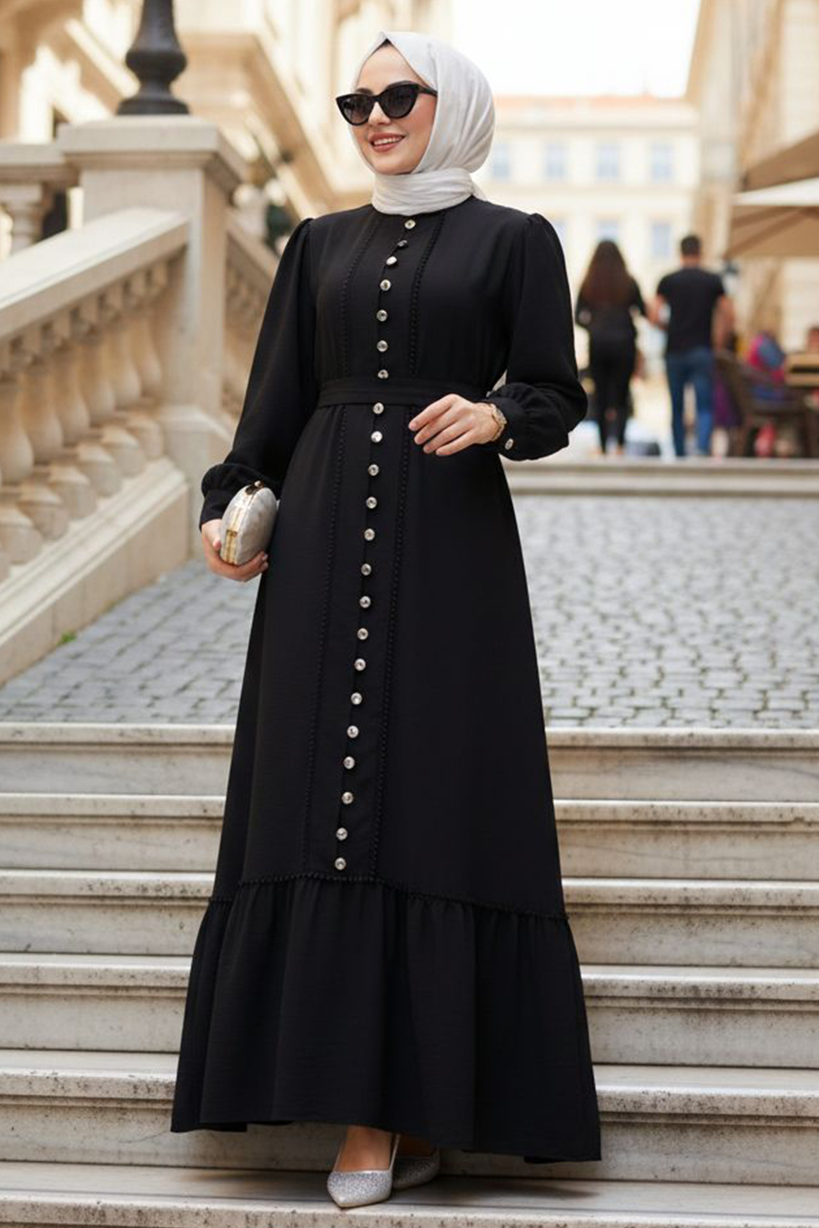 Ürün Özelliği: Sıfır yaka, uzun kollu, manşetli, ön ortadan düğmeli, etek ucu volanlı ve kendi kumaşından kemerlidir.