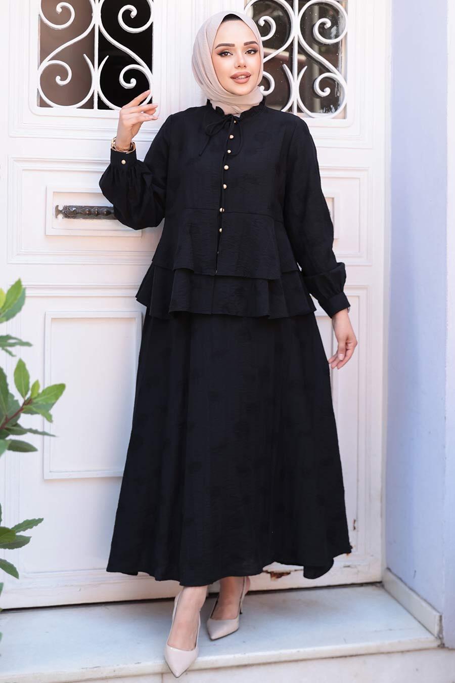 Düğmeli Siyah Tesettür Etekli İkili Takım 14334S