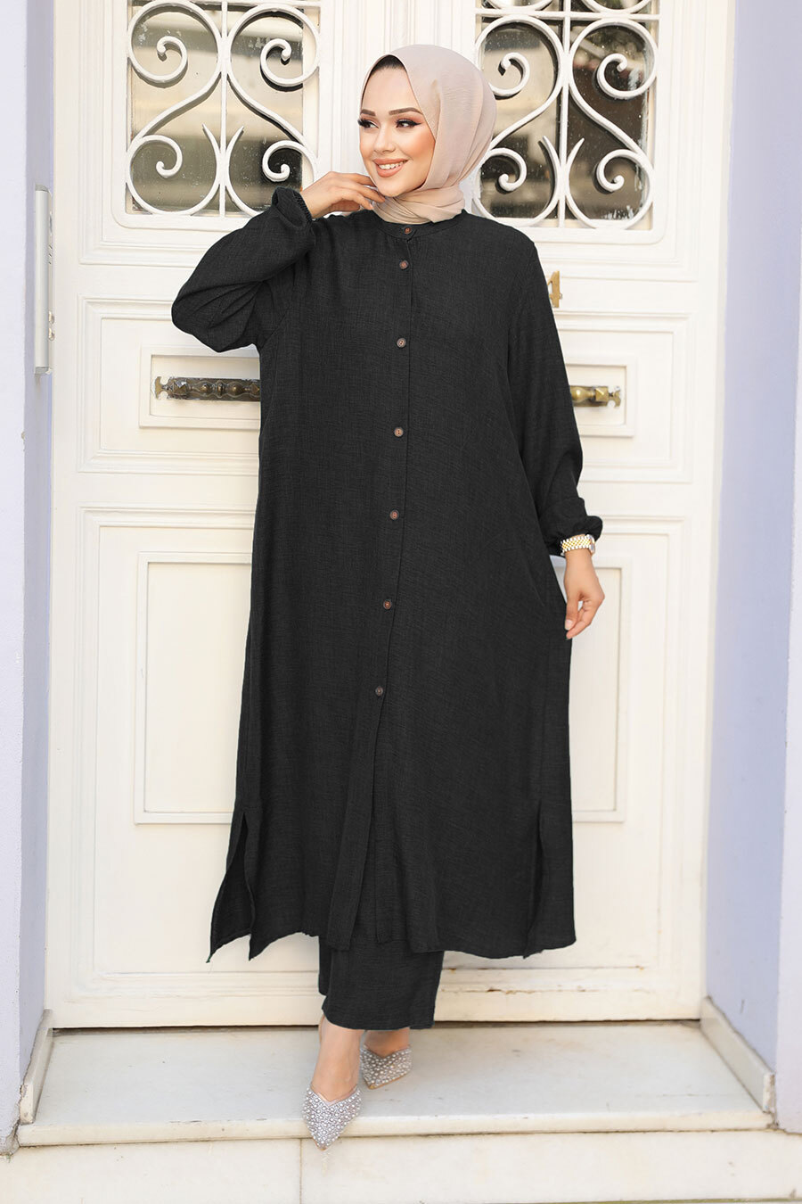 Kumaş Özelliği: %100 Polyester kumaştan üretilmiştir.Ürün Özelliği: Sıfır yaka, uzun kollu, kol ucu lastikli, ön ortadan düğmeli, etek ucu yırtmaçlı, pantolon belden lastikli ve boru paçadır.