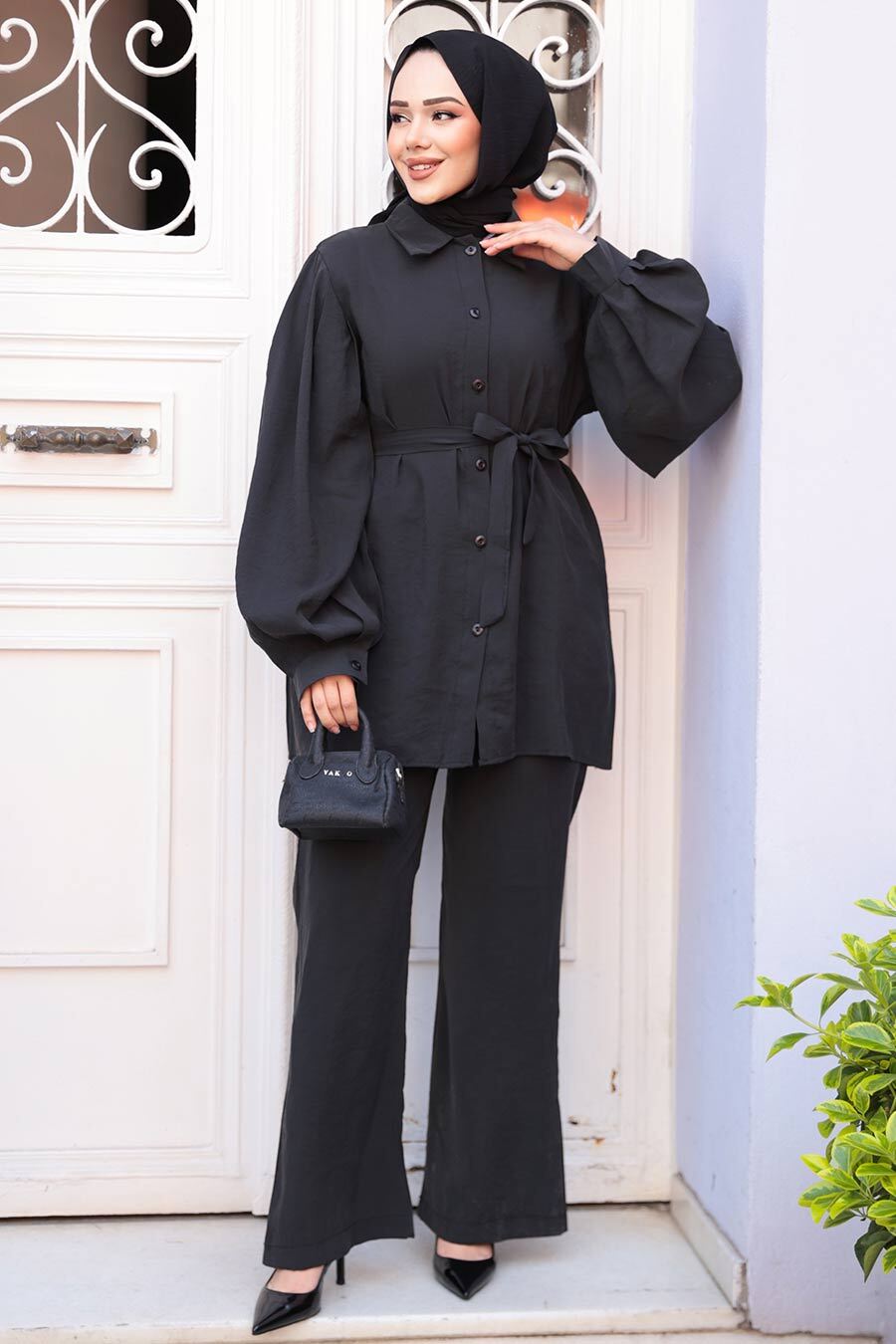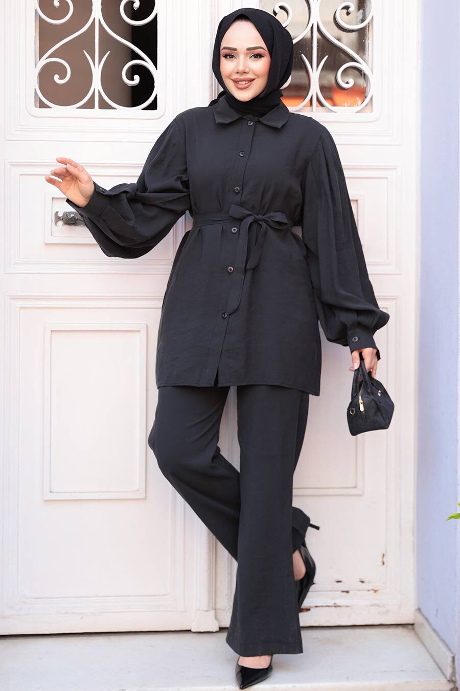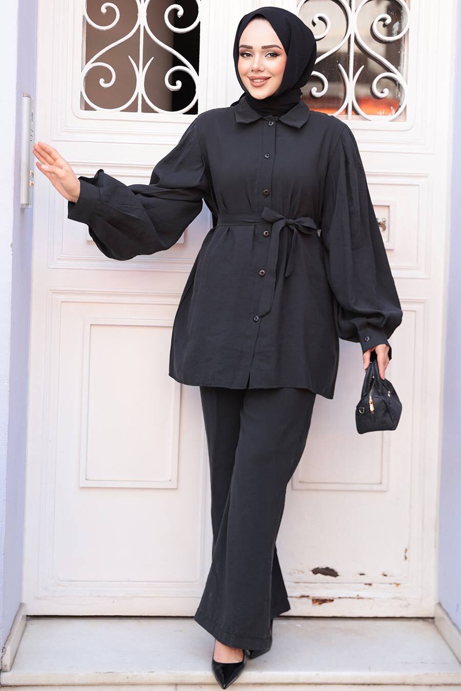 Ürün Özelliği: Klasik yaka, uzun kollu, manşetli, ön ortadan düğmeli, kendi kumaşından kemerli, pantolon belden lastikli ve boru paçadır.