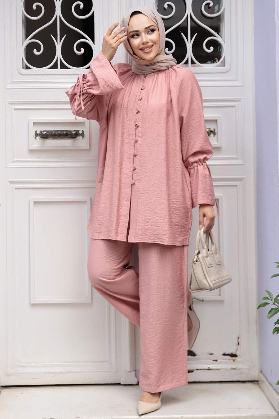 Ürün Özelliği: Sıfır yaka, uzun kollu, kolu bağcıklı, ön ortadan düğmeli, pantolon belden lastikli ve geniş paçadır.
