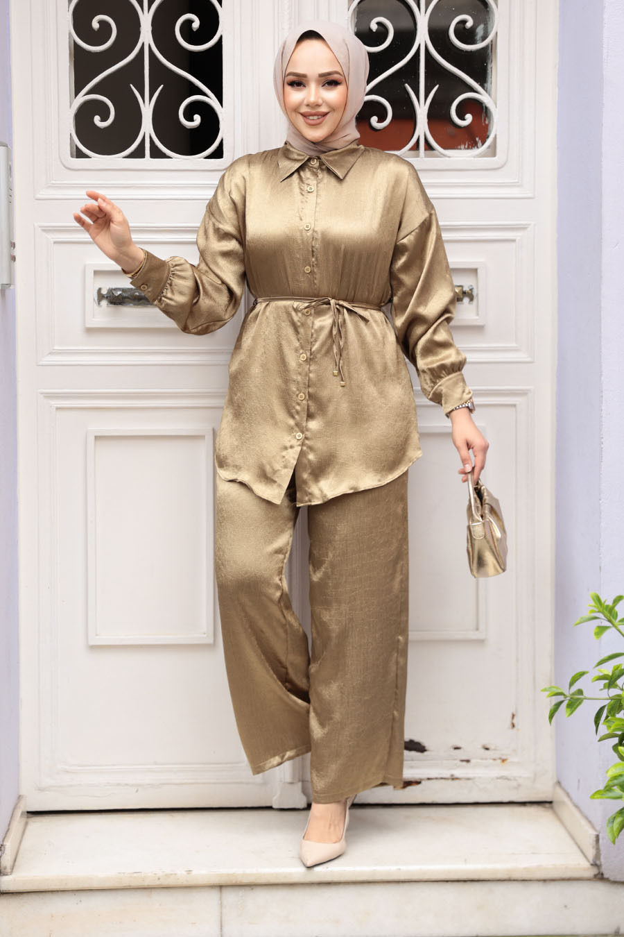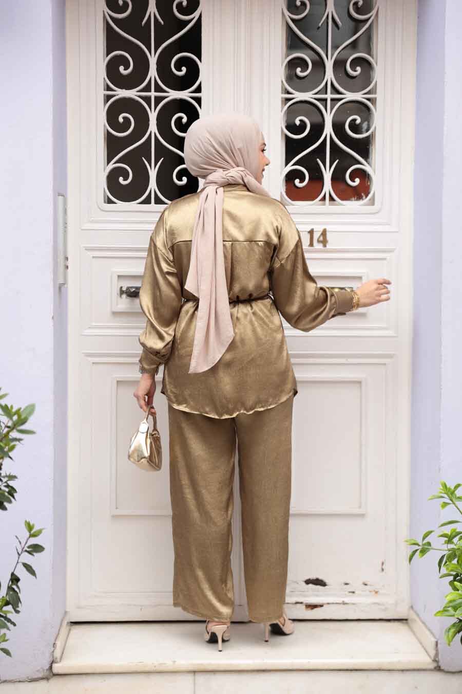 Ürün Özelliği: Klasik yaka, uzun kollu, manşetli, belden ip kemerli, ön ortadan düğmeli, pantolon belden lastikli ve geniş paçadır.