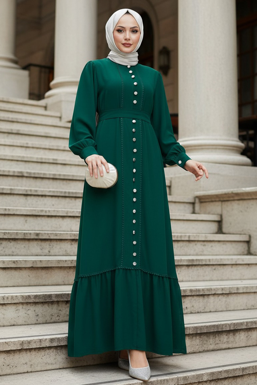Ürün Özelliği: Sıfır yaka, uzun kollu, manşetli, ön ortadan düğmeli, etek ucu volanlı ve kendi kumaşından kemerlidir.